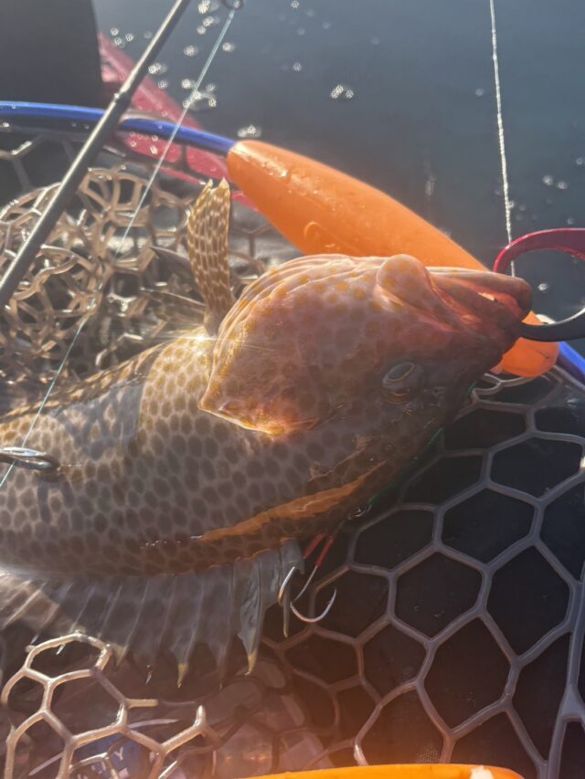 新年初釣りは東紀州エリアでカヤックを出してきました。この日は気温が高く日差しも合わさり日中は暑いくらいでした。11時くらいまでは風の予報がなさそうだったので魚探と睨み合いながら少し沖までポイントを探りましたが特に反応は見つからず…無暗にやっても釣れないので水深15-20mほどの根のあるポイントへ行きました。個人的に信頼を置いているフラッグトラップ40g・スイミングテンヤ30gとバルト4inc+ブレード付で底をサーチすると40超のオオモンハタをキャッチできました。お土産を確保できたので再度水深50-60mのエリアでジグ・タイラバと試しましたが昼前にタイムアップしました。海水も透き通っており水深10m程なら海底も見えてしまうほどキレイでした。