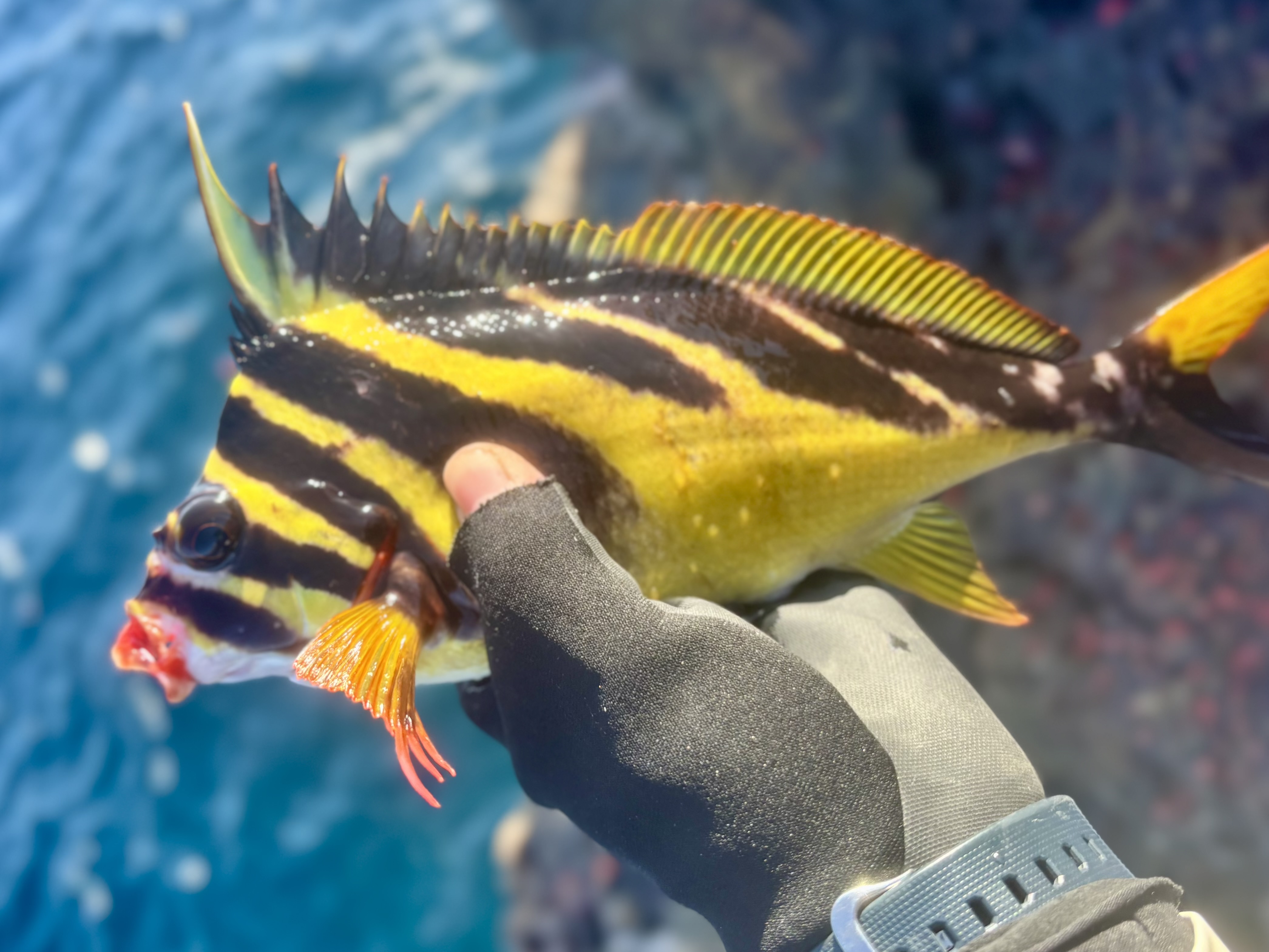 下げ止まりで一旦ご飯休憩し、上げ始めを狙うと強烈なアタリ!慎重にファイトすると35センチ程のイシガキダイが上がってきました!ここから神子元特有の激流が始まるかと思いましたが、この日は全く流れず…。60オーバーのアオブダイとタカノハダイの仲間(ミギマキ?)が釣れて終了。神子元らしい釣りはあまり出来ませんでしたが、久しぶりに良型グレと遊べたので満足の釣行でした!