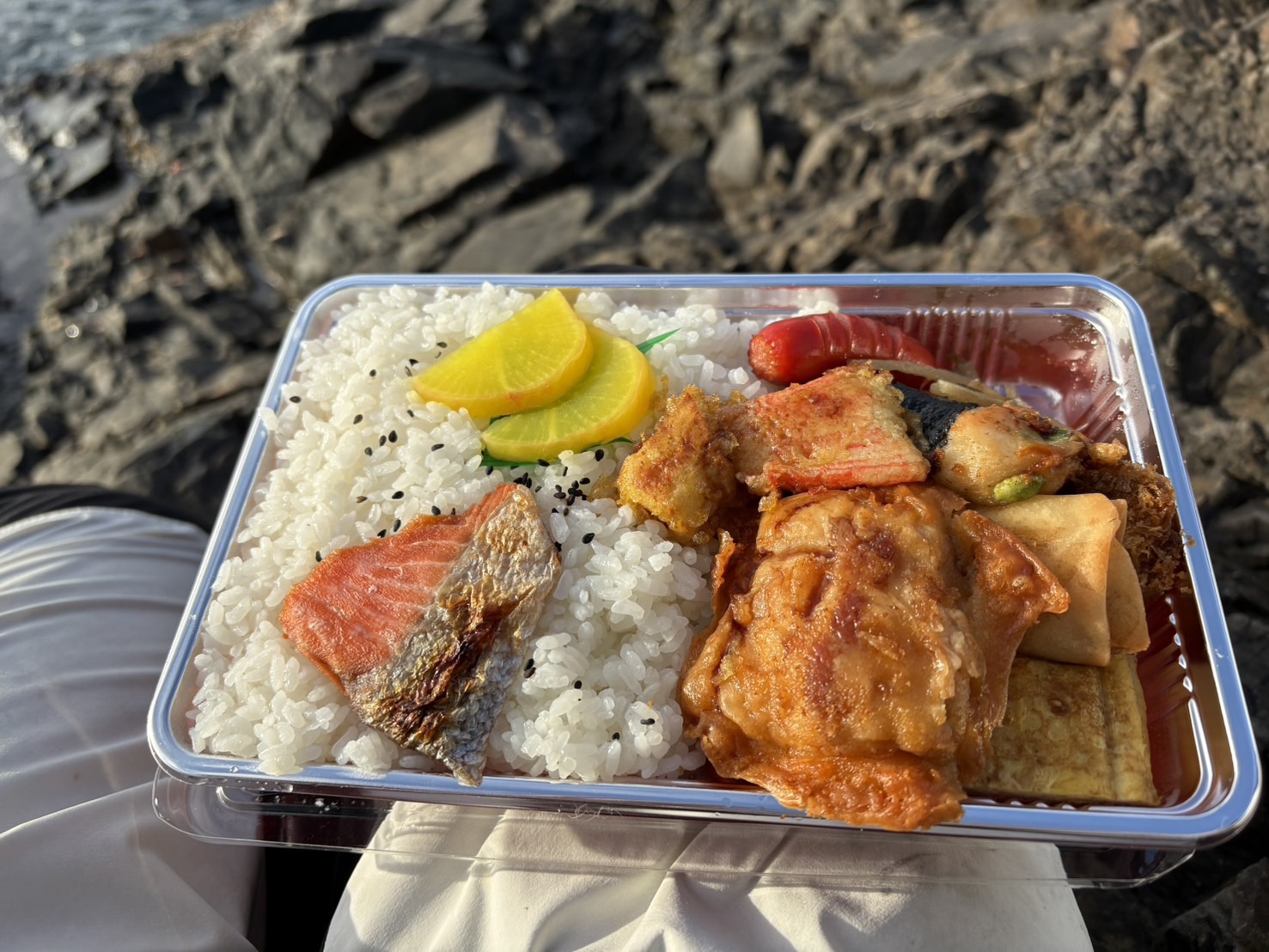 しかし、さらに風が強くなり、いよいよ釣りにならなくなったので弁当船で双子島へ移動しましたが私はアタリなく終了。名人はしっかり40センチのグレを釣っていました!