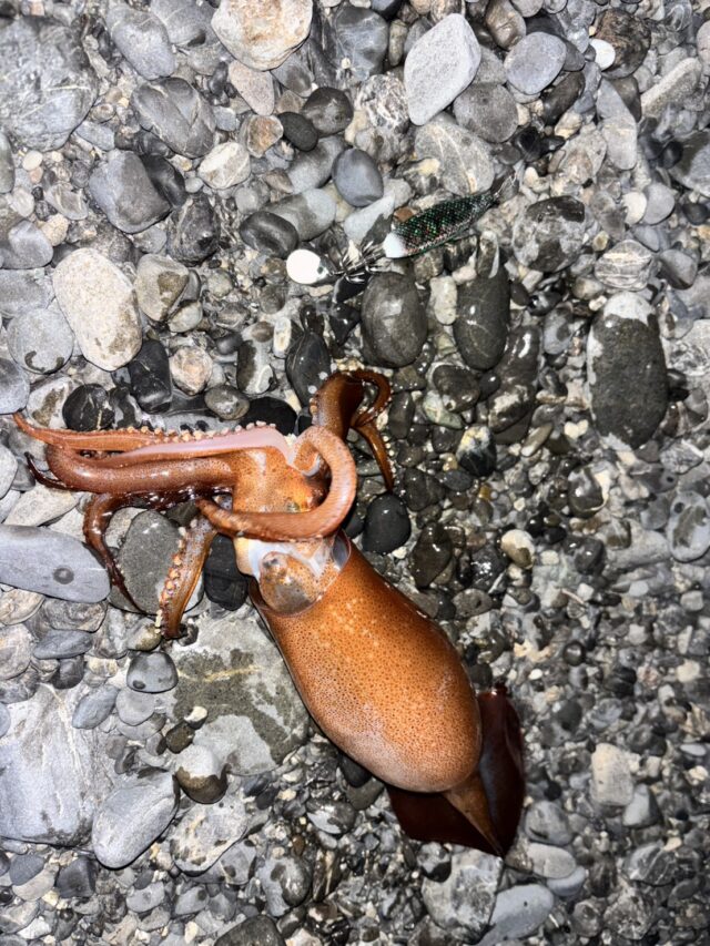 上げ潮後半で暖かい潮が入ってくるので期待大!前回と同じくグローシールチューンしたジークのIKキャスト25gをフルキャスト!何投かしていると着水後15秒ほどでヒット!やっぱりスルメイカ!