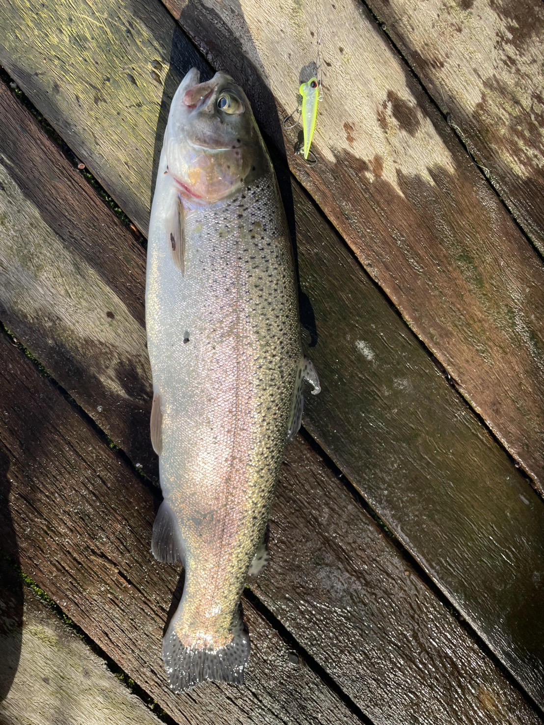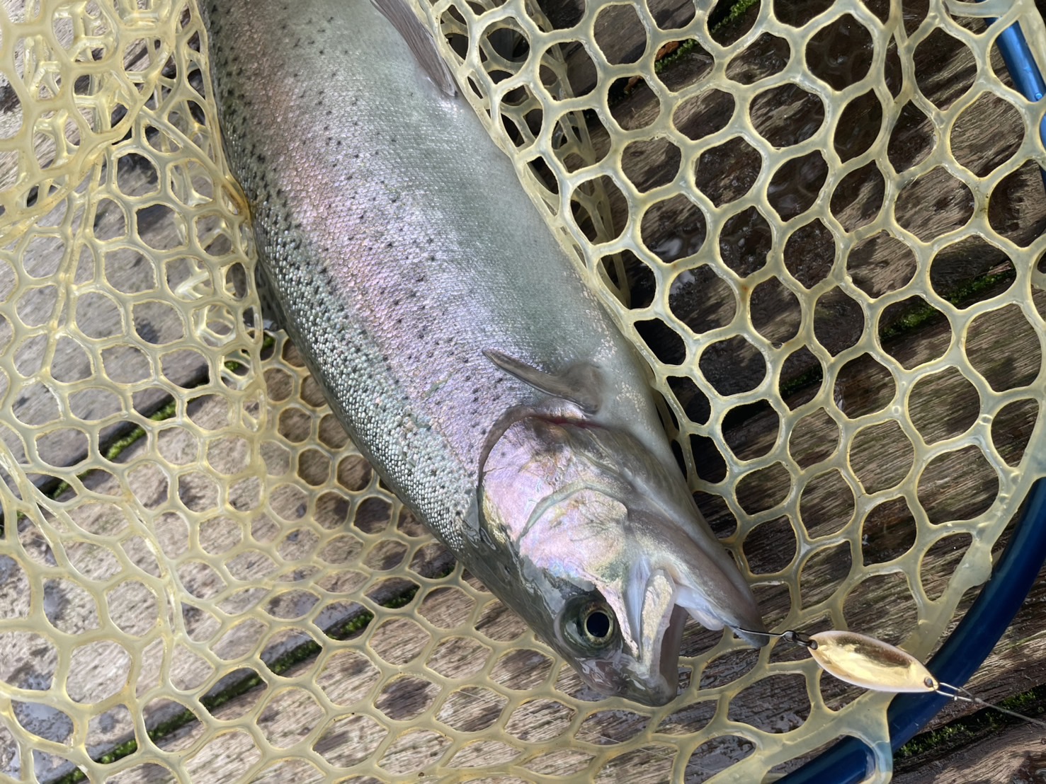 カラーローテ。まだ朝の高活性が残ってることに期待して放流系のゴールドカラー。変えた1投目でヒット!同じ深さ、同じ誘いでした。さらにカラーローテでサクラマスも!