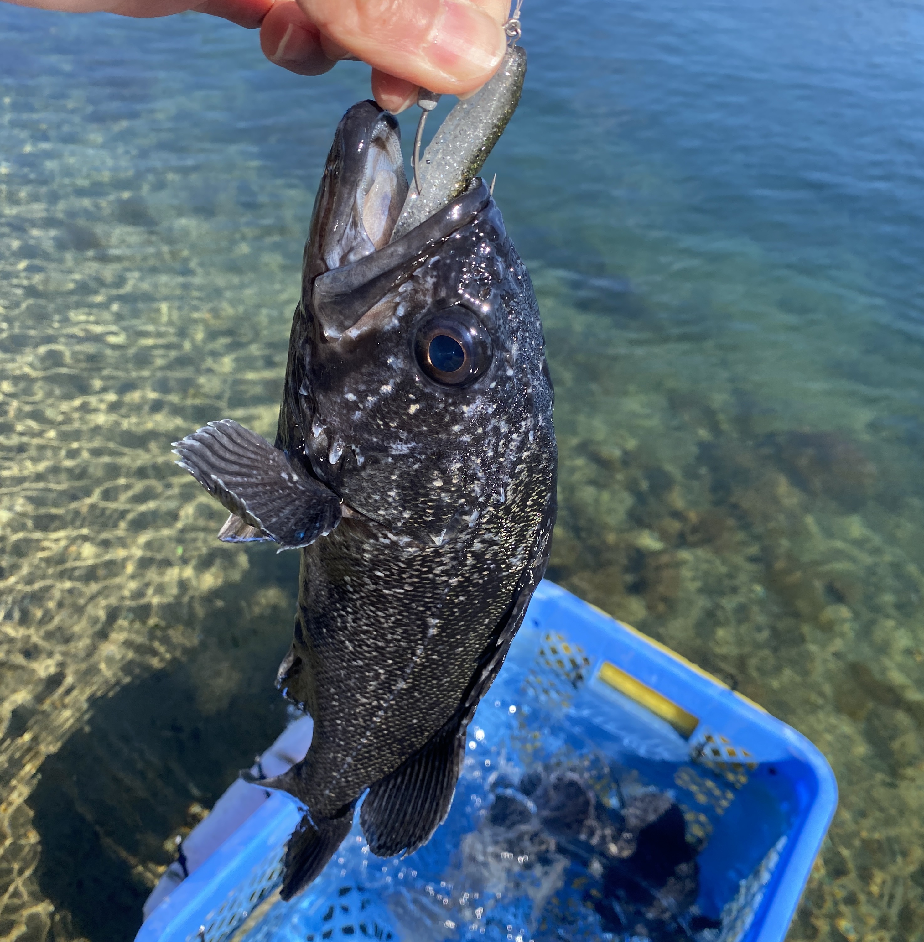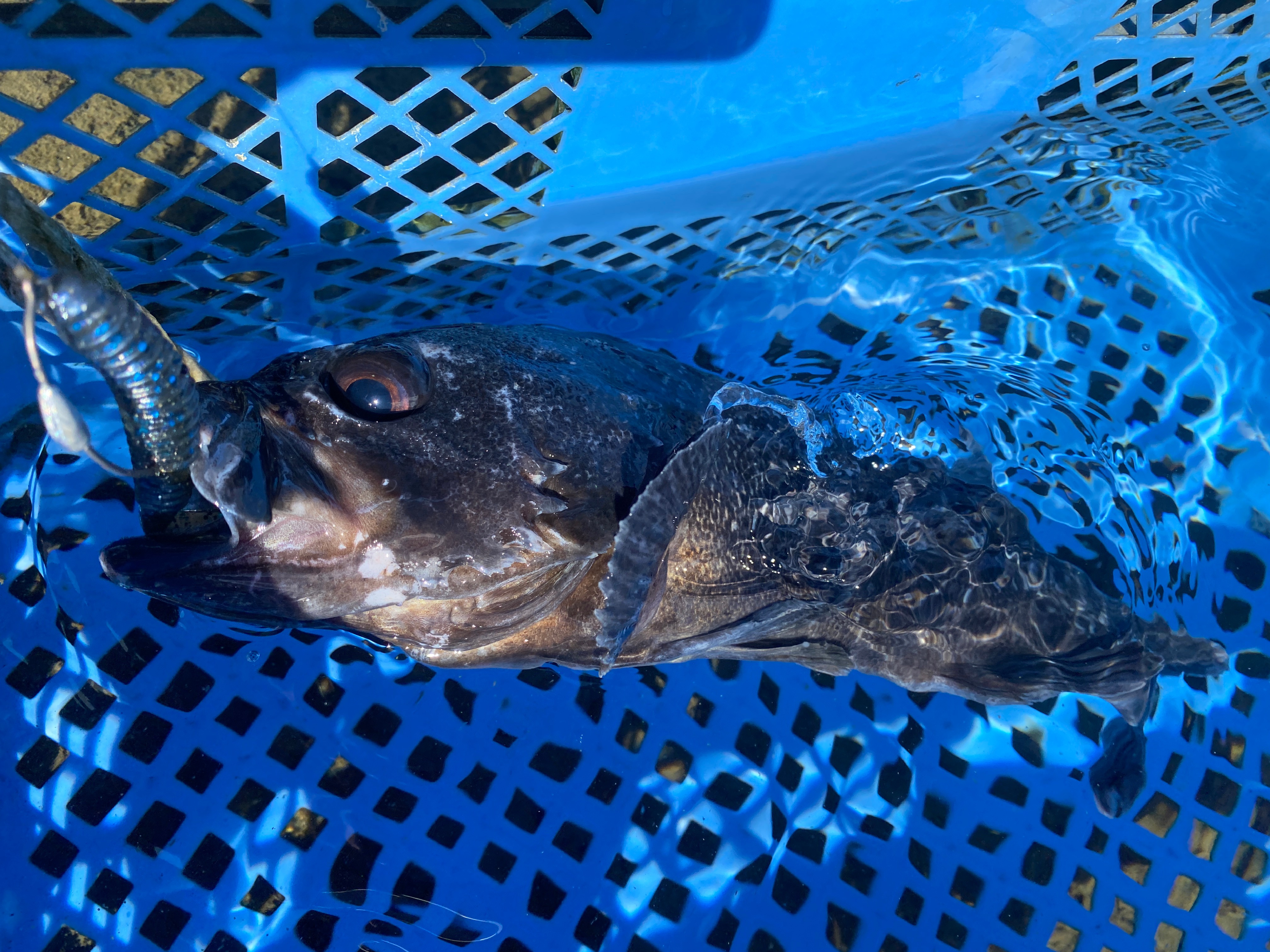 午後券での入場。既に午前から5名が竿を出しており、カゴはクロソイで真っ黒。(行くなら午前中がおすすめです)