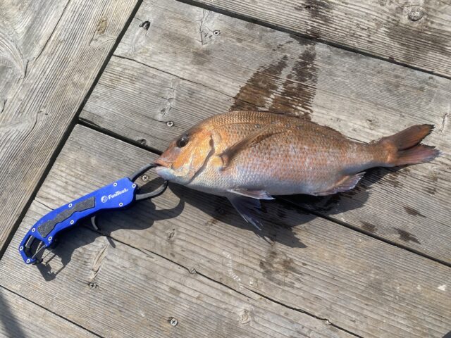 何とかせねばとたどり着いたのが、オモリ無しの完全フカセ。やっとこさアタリが出てマダイをゲット!
