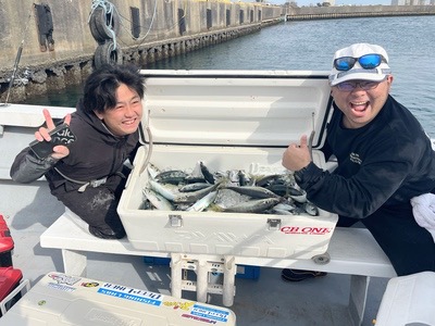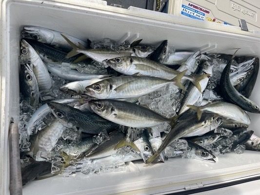 そんなこんなで終了まで釣れ続け、あっという間の楽しい釣行でした。二人で80Lクーラーの3分の2は魚で埋まりました。アジは美味しいのでいくらあっても足りませんね。