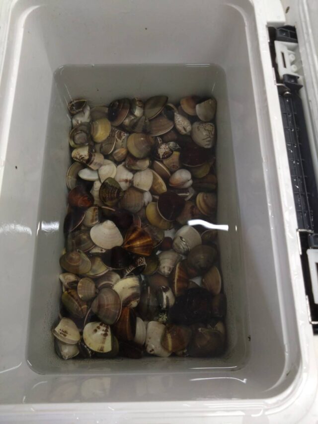 当日持参したものは、耐油手袋と防寒服のみであとは同僚に借りましたが、ジョレン、ウェーダーラジアル底とレインウェアーと貝入れるカゴ、クーラーは必須です。※クーラーの画僧は2人分のハマグリです。