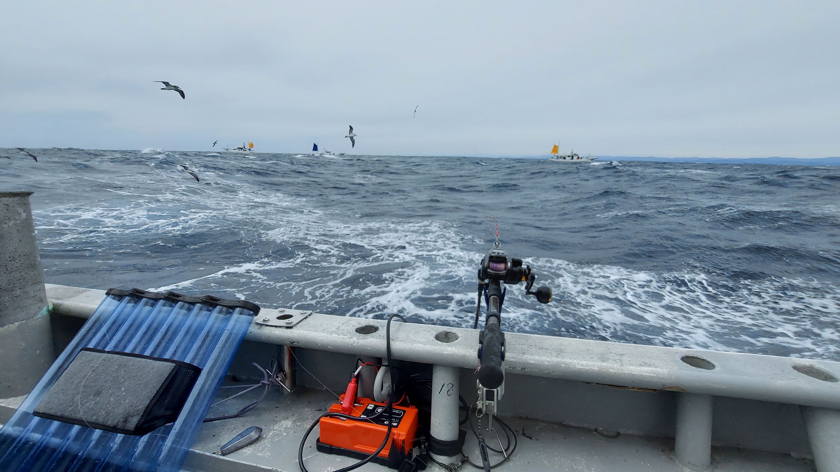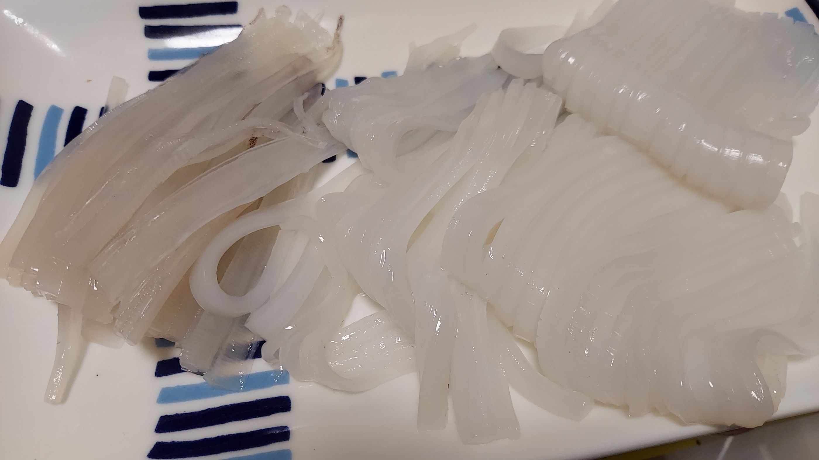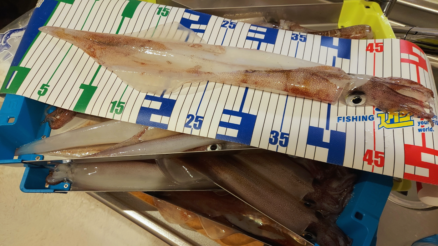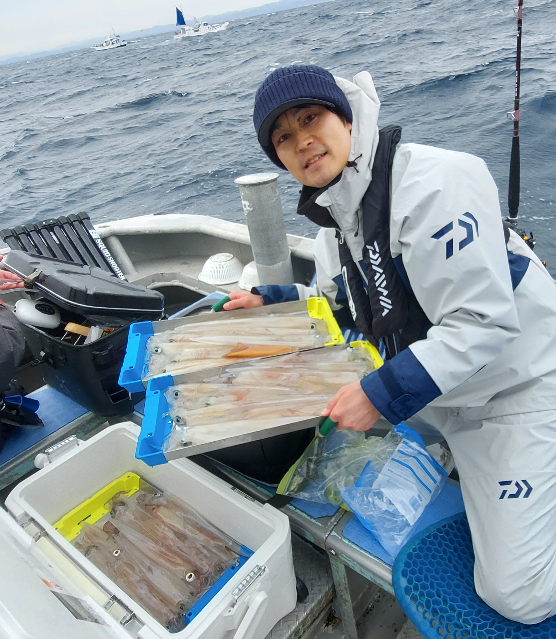 大進丸様にお世話になりヤリイカ釣行して来ました。2月の中旬から情報が出始め、3月初めに悪天候や満船で行けず、ようやく出船することが出来ました。ヤリイカは以前、静岡の店舗に勤務していた時に行った『冬の石花海ヤリイカ』で使っていた用品がそのまま使えました。竿はダイワさんの『ディープゾーンGS150-205』、リールは『ビーストマスター2000』。仕掛けは『ダイヤエース11cm』で幹糸5号、エダス3号の6本針を自作しました。オモリは120号統一です。ポイントまでは1時間半ほど走ります。爆風、荒波の中、有名船で船団が出来ていました。水深115m程。反応はボトム付近です。落としていくと100m程で仕掛けが止まりました。反応バリバリのようで、落とすだけで掛かるパターンのようです。1杯掛かったら低速で10m撒いて『追い乗り』を狙います。ある程度誘ったら回収です。幸先良く、1投目で3杯ゲット!しかも胴長40cmはあるかというパラソルサイズです。次の投入では80mラインで仕掛けが止まりました。おかしい・・・。回収するとムギイカ(スルメイカの子供)が釣れました。次の流しも同一パターンだったので、仮説を思い浮かべました。ボトムはヤリイカ、その上にムギイカの層がある。次の流しは80mで止まるのを無視してボトムまで落とし込むと、ヤリイカが6本針すべてに掛かり鯉のぼり状態!今回はムギイカは無視してボトムを狙い撃つ作戦にしました。スルメイカは別で夏場にやっつけます(笑)中盤までは1流しで2杯、3杯と順調に数を伸ばします。潮は良く他の方とのおまつりは無かったですが、問題は回収した仕掛けを如何に絡まずに投入し続けることが出来るかがカギです。顔に墨攻撃を食らいながらもやり続けました。午後から悪天候になるということで11時半納竿でしたが、大満足の釣行でした。日ムラはあるようですが、今回は他の船も大漁だったようです!ヤリイカ行くならお早めに!投入器はご自身ででご用意お願いします。