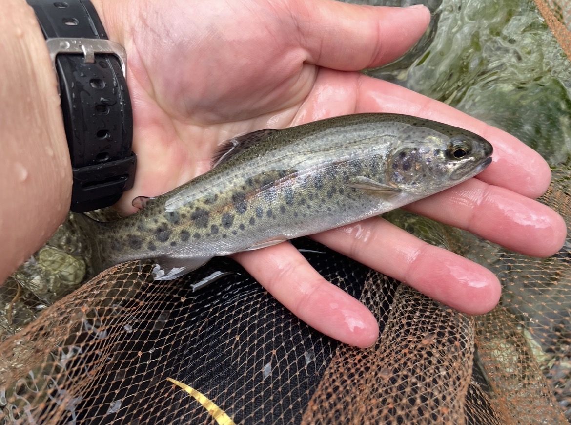 13時頃現着。前回後半に入ったポイントへ入り途中までだった続きをやってみました。何にも反応無く大堰堤まで来ます。横に薮の道があったので、堰堤を越えて上流側へ。100m程渓流でまた大堰堤(笑)閉鎖的ですが横に沢があるので、しみ出し効果があるかとやってみました。さっそくやってみるとアタリ!小さなニジマスが釣れました!その後もポツポツアタリがあり、この100m区間で5匹のニジマスが釣れました!最大17cm程。ニジマスにはブドウ虫が高反応でした!今度も堰堤の横の山道で迂回して上流側へ。地図をみると次の堰堤まで距離がある様なのでやっていきます。今度は魚影が少ないですが落ち込みにキンパクを落とすとトッとアタリ!合わせると黒っぽいアマゴが釣れました!カッコいい!満足して17時頃帰路につきました。