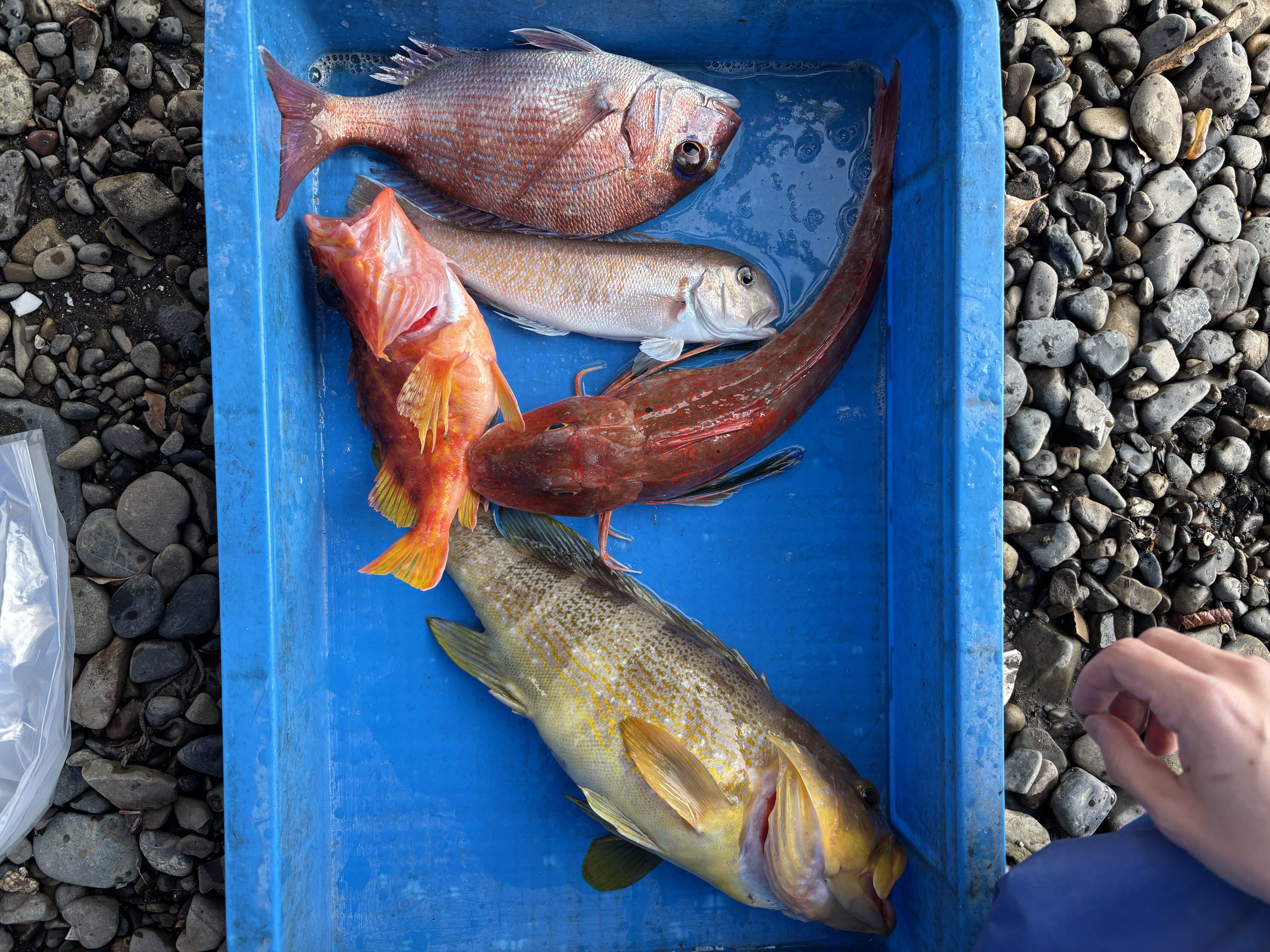 しかしベイトの反応はうすく、クラゲが魚探に映るなどもあり苦戦。地形を釣ることにし、アオハタやアヤメカサゴ等を追加。