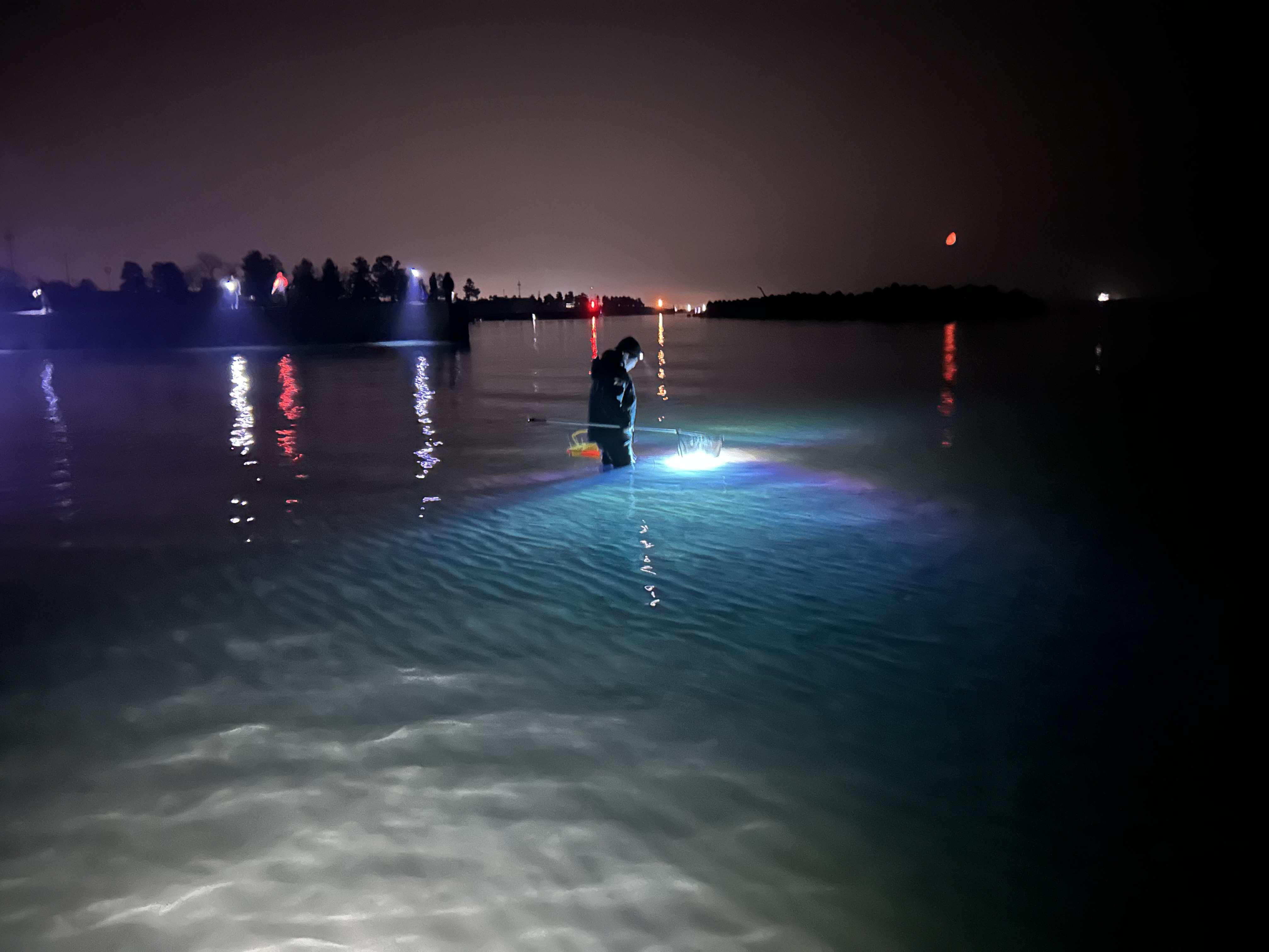 今回は以前からやってみたかった、今が旬の富山県のホタルイカ掬いに初挑戦してきました。イメージとしては暗くなってからウェーダーで海に入り、ヘッドライトで水中のホタルイカを探し、掬う。当日は家を13時に出発し、寄り道しながらまだ明るい時間に到着し、ポイントチェック。その後は妻の友人家族と回転寿司で寿司を食べながらのホタルイカ地元情報を収集。最近は夜中の2時頃からホタルイカが湧く事が多く、仮眠をして1時から開始。風向きでポイントも決まってくるらしく、言われるがままにおすすめポイントで1時からスタート。ヘッドライトにウェーダー、フロートを付けたカゴに水中ライトは今回のホタルイカの為に購入。夜中なのに浜には沢山の人がホタルイカを探しまわっていて、テンションが上がります。ただこの日はまさかの誰もホタルイカを掬う事ができず、残念な日となってしまいました。周りの人は良型のイワシを何匹か掬っている人がいました。今回の経験を活かし、次回は爆ワキの日に行きたいと思います。
