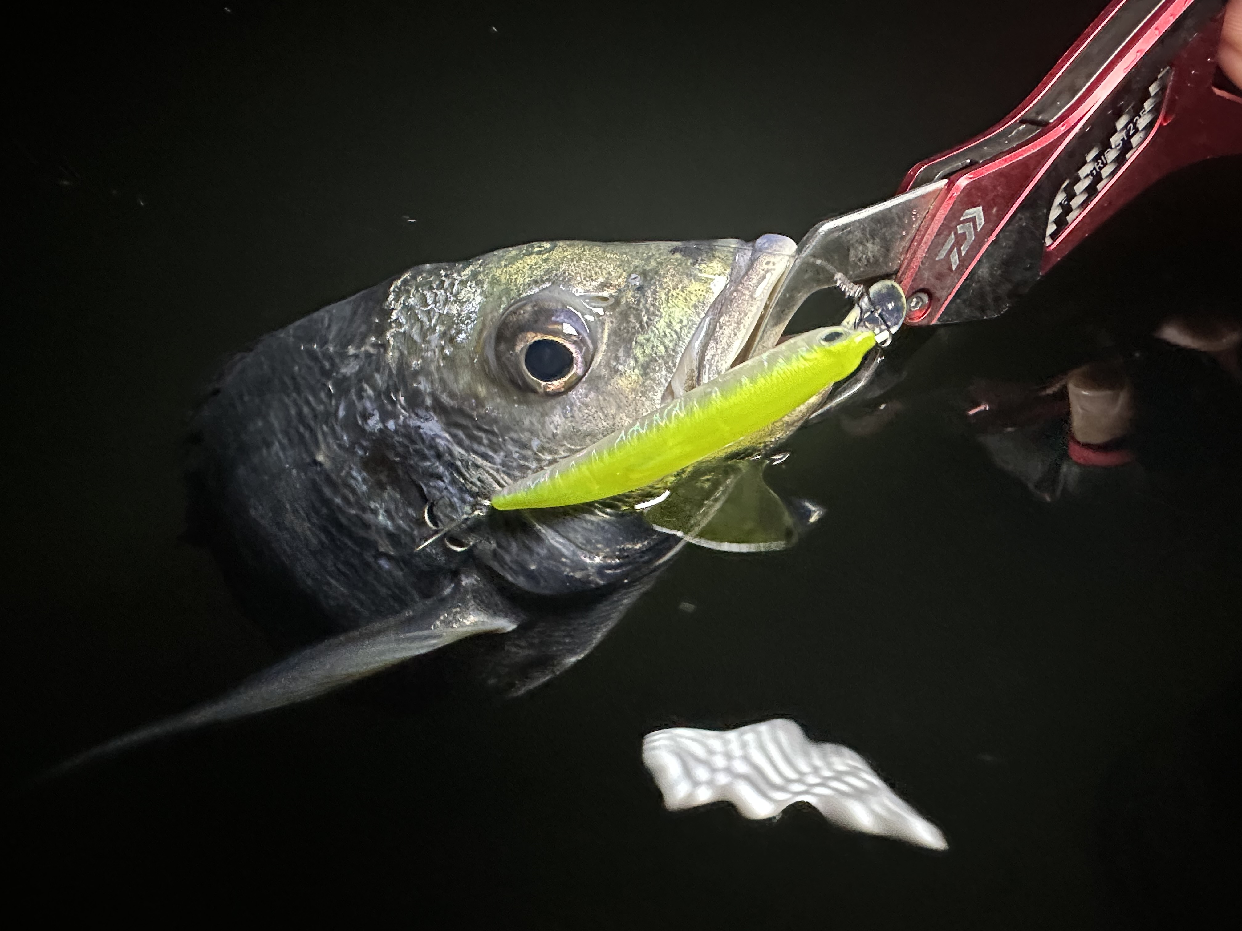 まずは、ジップベイツさんの「システムミノー7F」で!さらに、スミスさん「サラナ80F」で!1091カラーに好反応でした!