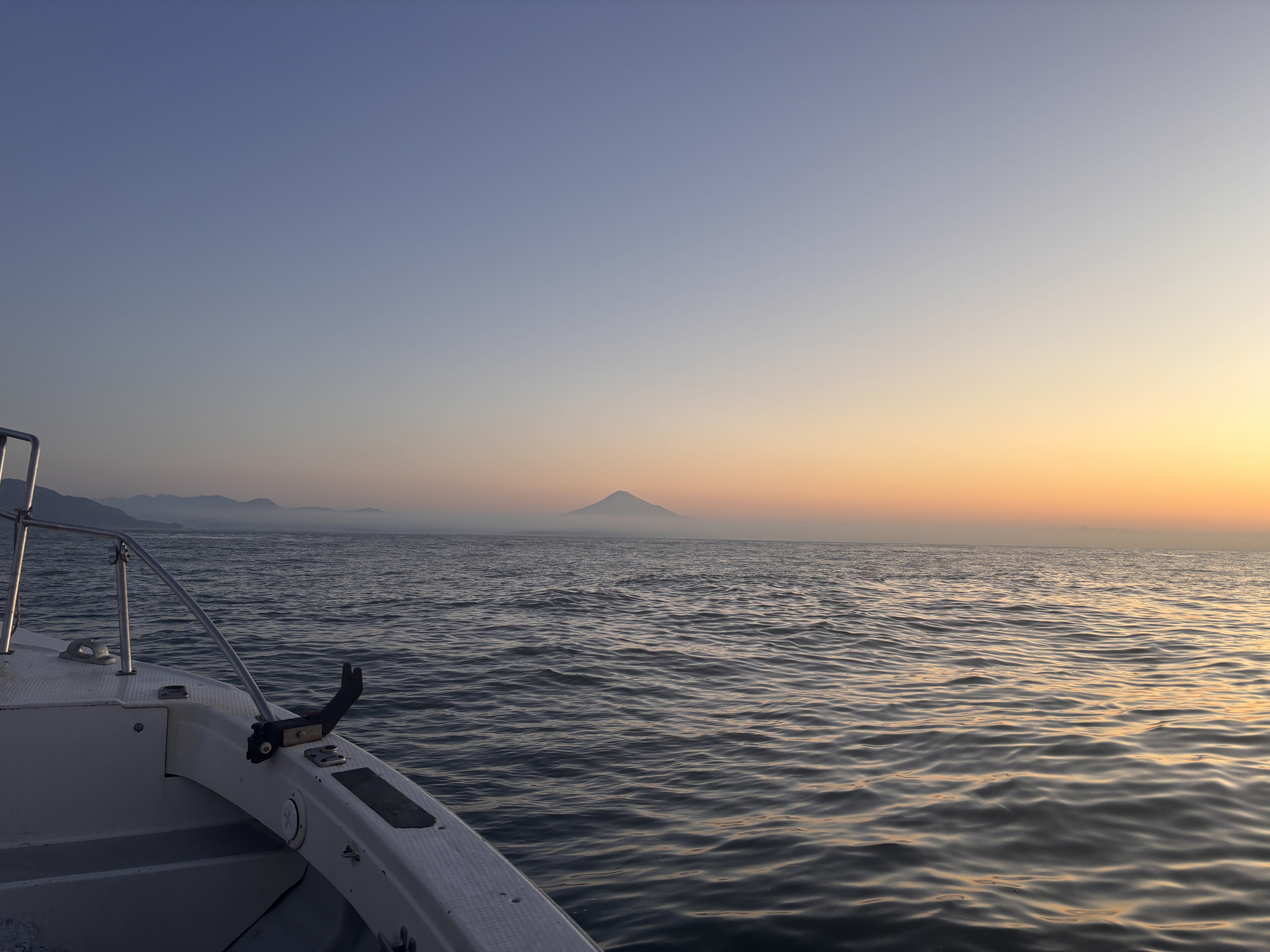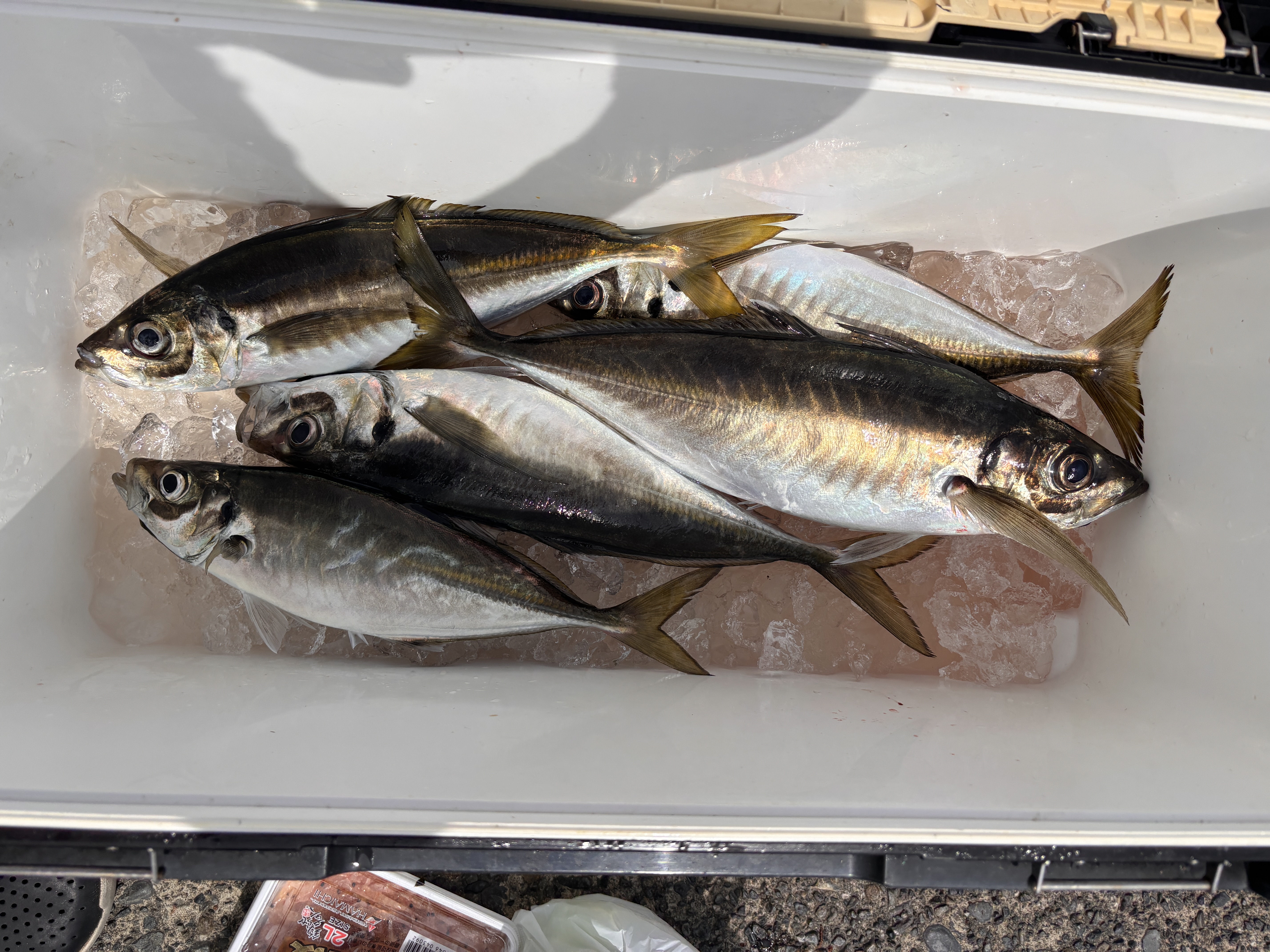 焼津・大友丸さんでデカアジ釣りにいってきました。前日から大雨で海は濁りうねりも若干残ってました。午前5時に出船しポイントに到着すると早速釣り開始です。オキアミコマセでオモリ100号、仕掛けは吹き流し2本針仕掛け3ⅿにクッションゴム1ⅿです。船長のアナウンスの棚にコマセを入れ同調させますが反応がなかなかありません。潮も動いておらず大苦戦です。針の軸を細くしたり、ルミックスダンサーを付けたりしてようやくアタリました。慎重に上げてくると丸々太った最高の激ウマアジです。サイズも44㎝あり感動ものです。しかしパターンを掴めずまた沈黙。忘れたころにぽつぽつ追加できる程度。終わってみれば最終5匹でした。テクニカルな釣りですが腕の差がはっきり出る焼津沖のアジコマセ釣り、非常に楽しいです。また行きたいと思います。