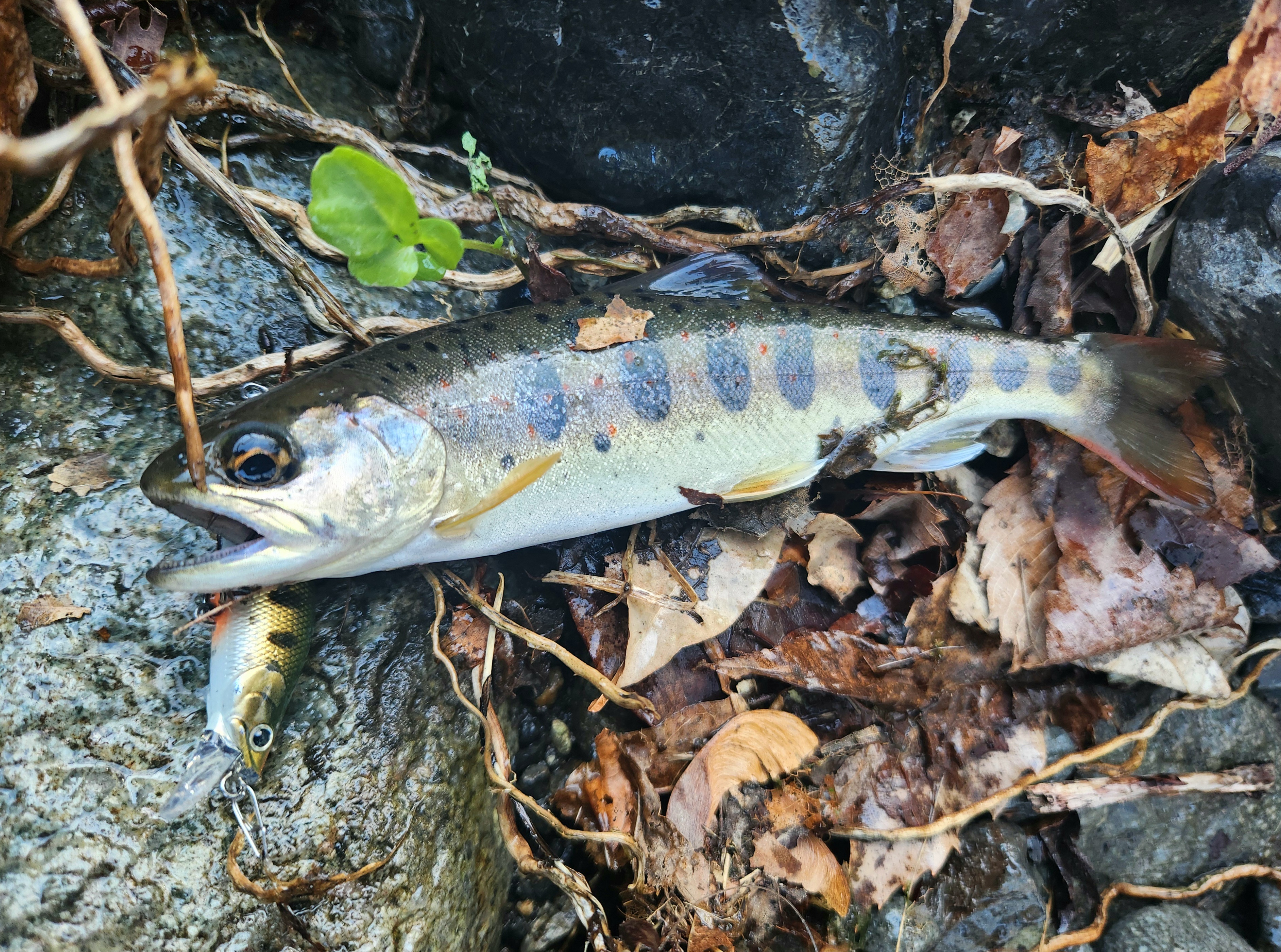 テンカラでやっているとたまに見に来ますが食いつかず。気がつくとお昼の2時に。帰る前に最後のポイントへ。今度はルアーでやってみるとやっと食いそうな追い方!そのまま釣り上がって行くと反応出だしてようやくヒット!小さいですが綺麗なアマゴ釣れました!