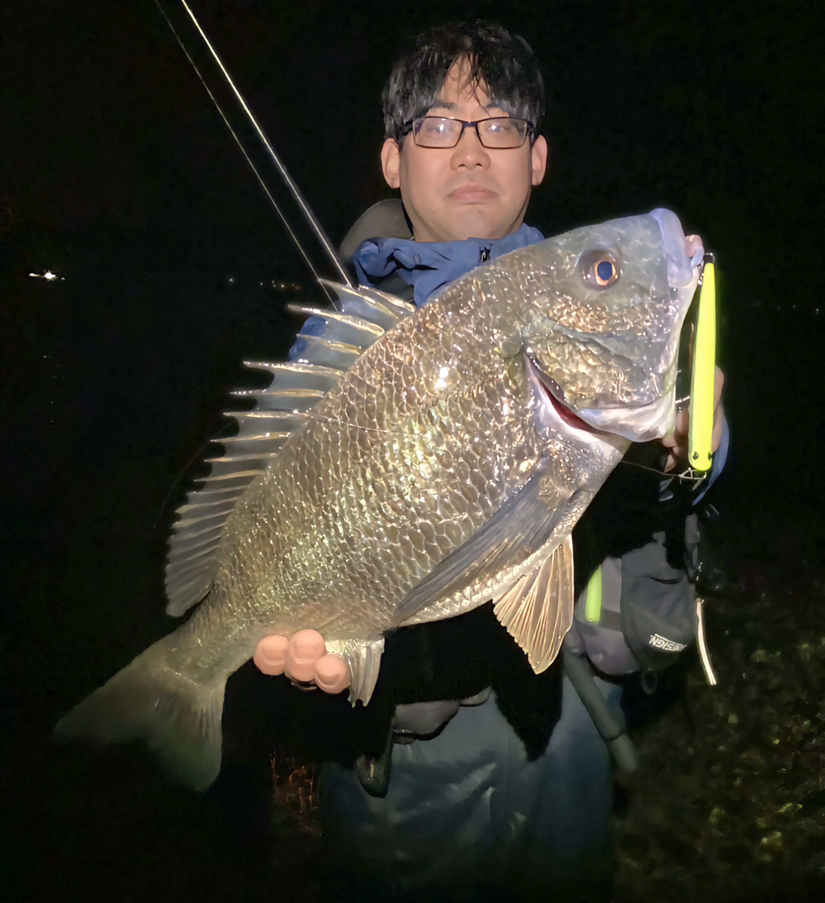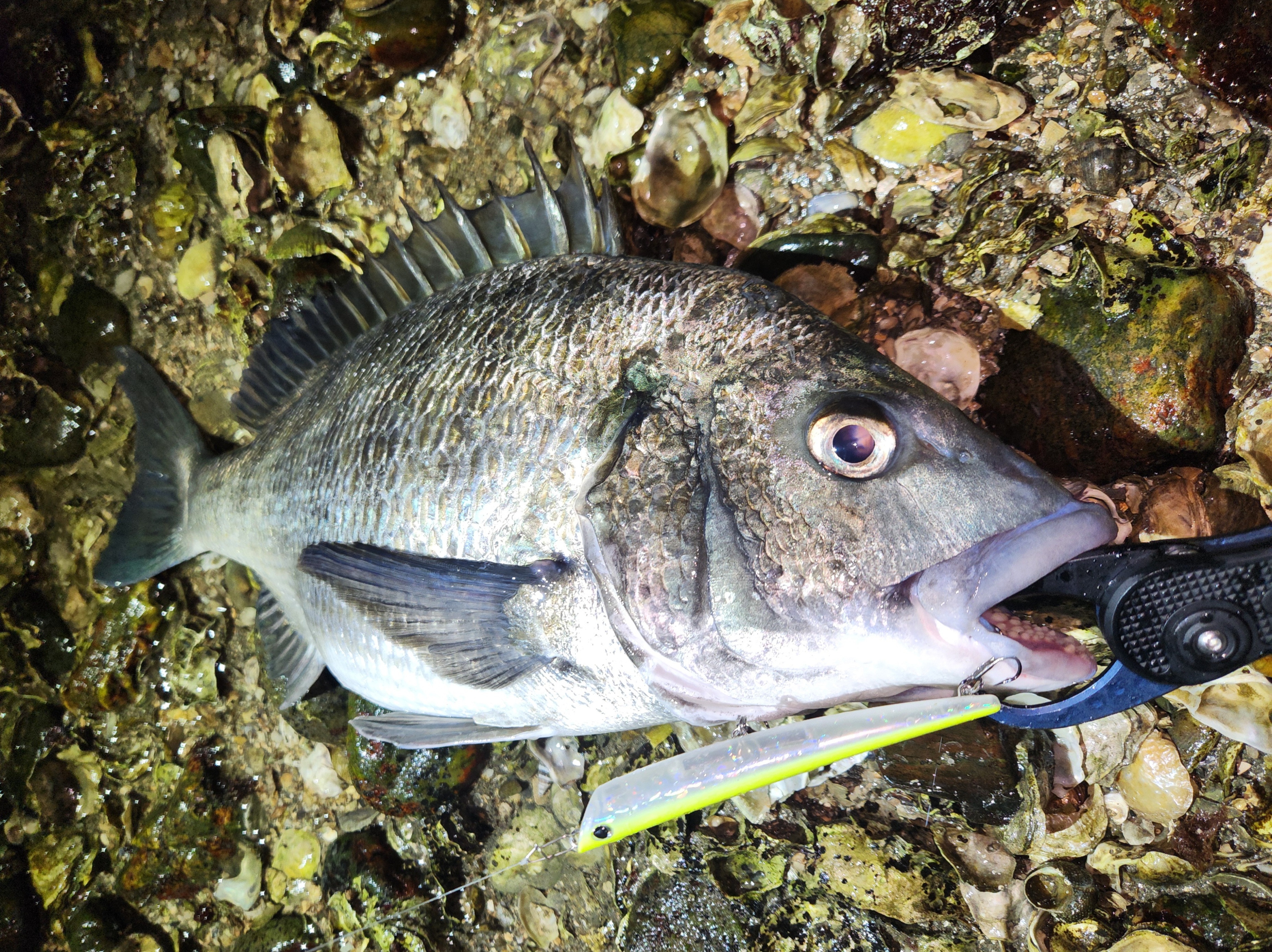その後ルアーをローテーションしていくと反応多く、パームスさん「タイニースプラッシャー100S」でゴンとアタリ!ヒットして重いですがエラ洗いしないのでチヌかなと、上がってきたのはいいサイズのチヌ!