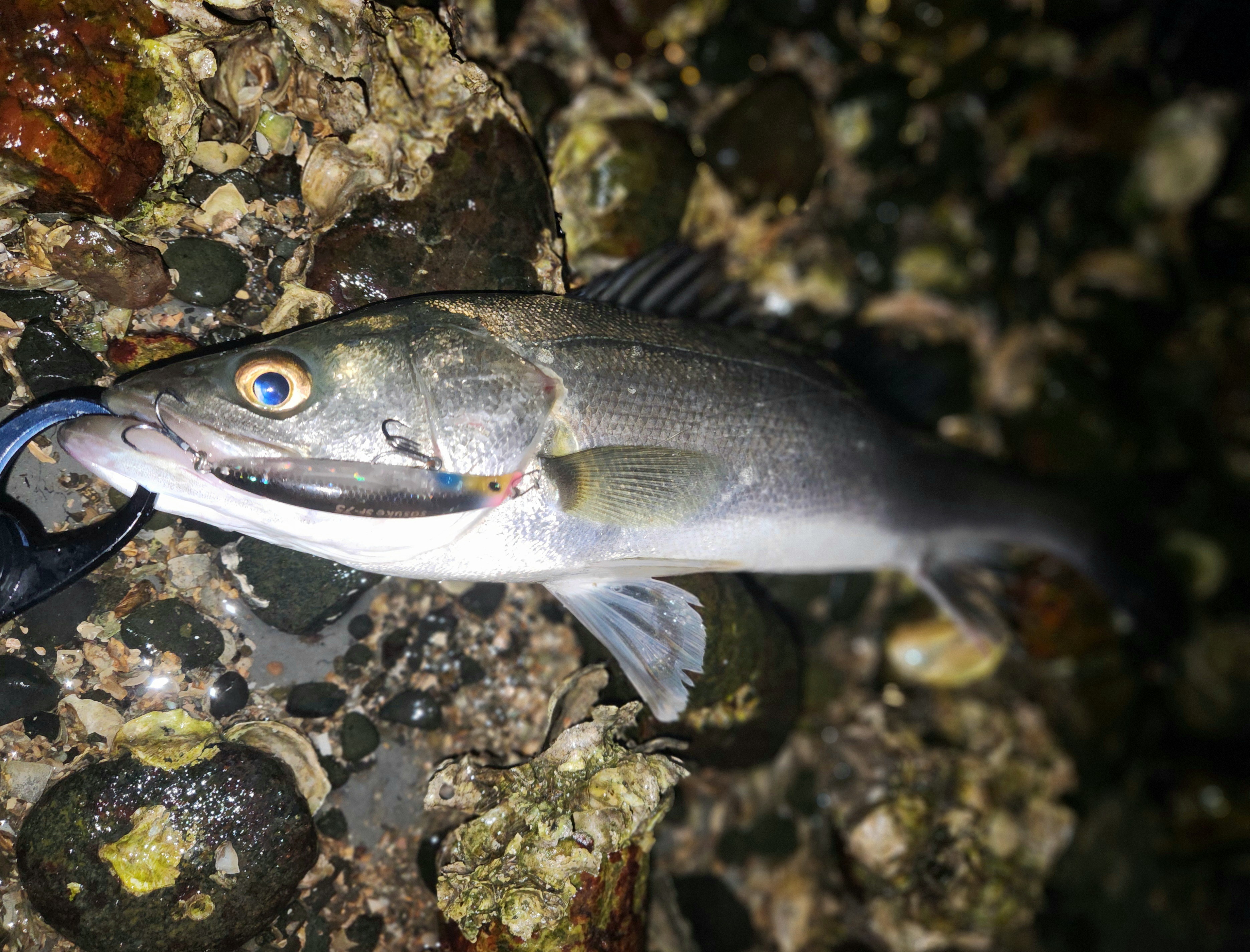 シーバスが釣れていないので表層付近をアイマさん「サスケsf-75」でゆっくり引いてくるとヒット!エラ洗いしてシーバス確定なので慎重にやり取りして無事ネットイン!小さいですがやっとシーバスが釣れてくれました。