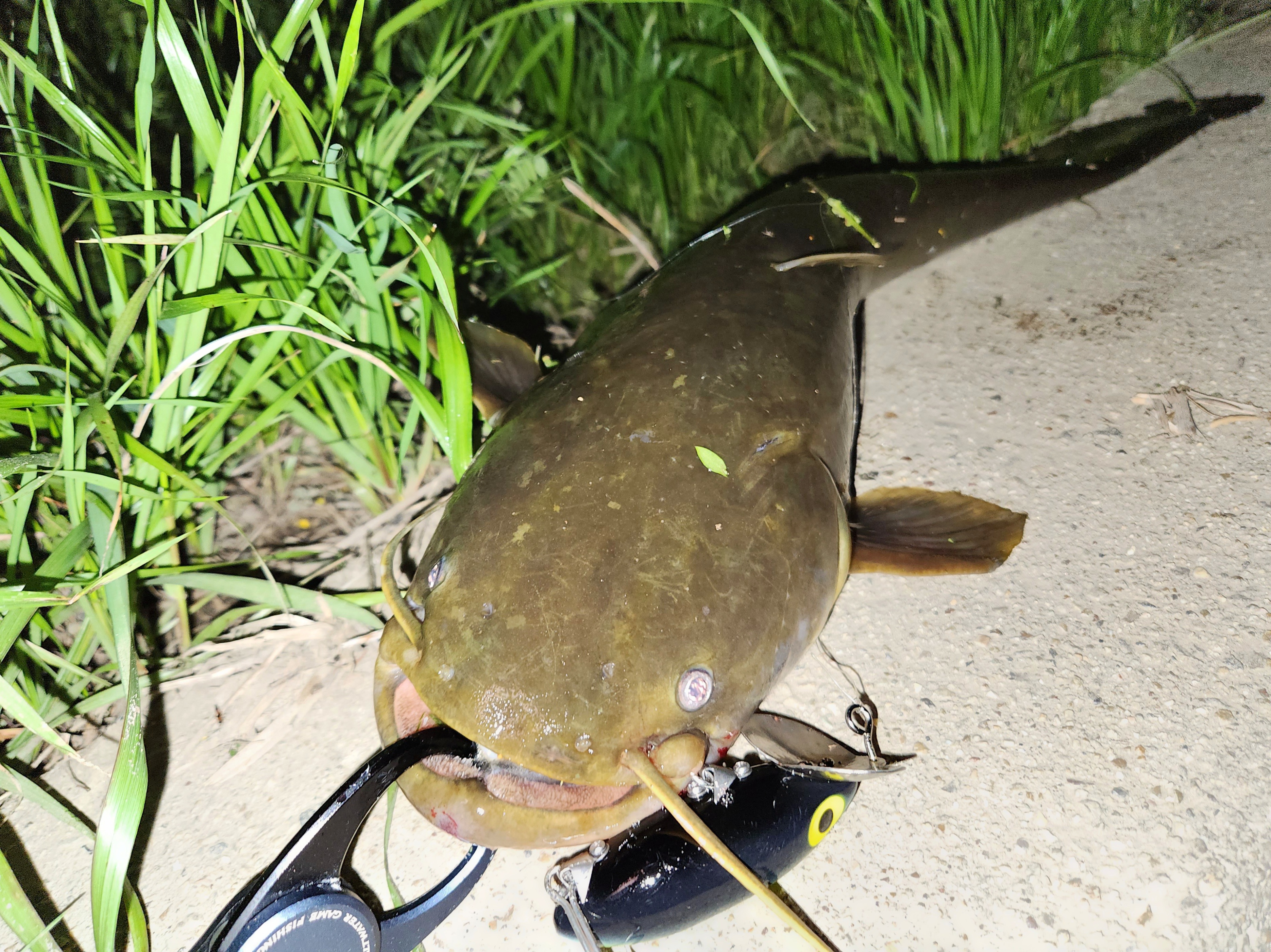 ルアーで狙います。FUNTOOLノイジー7で水面をポコポコ引いてきます。水路を練り歩きどんどん投げていくと別の水路との合流点へ。するとボフッとバイト!のらなかったのでゆっくり巻き続けるとまたバイトしてきて今度はヒット!50cmオーバーのいいナマズが釣れました。