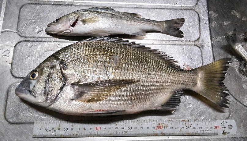 後半の短時間でセイゴを探しに行ってみたところ しばし投げると地味なアタリが出てセイゴをゲット!すぐに次を狙っていると根掛かり!とロッドを立てたところで グッ と押さえ込まれる、送れないので即アワセで何とか掛ける~ドラグを出されながらも浮かせたのはキビレかと思いましたがネットに入れて上げて見るとクロダイでした。次のアタリは弾く感じで出ましたが乗せきれず夜明けにて終了です。