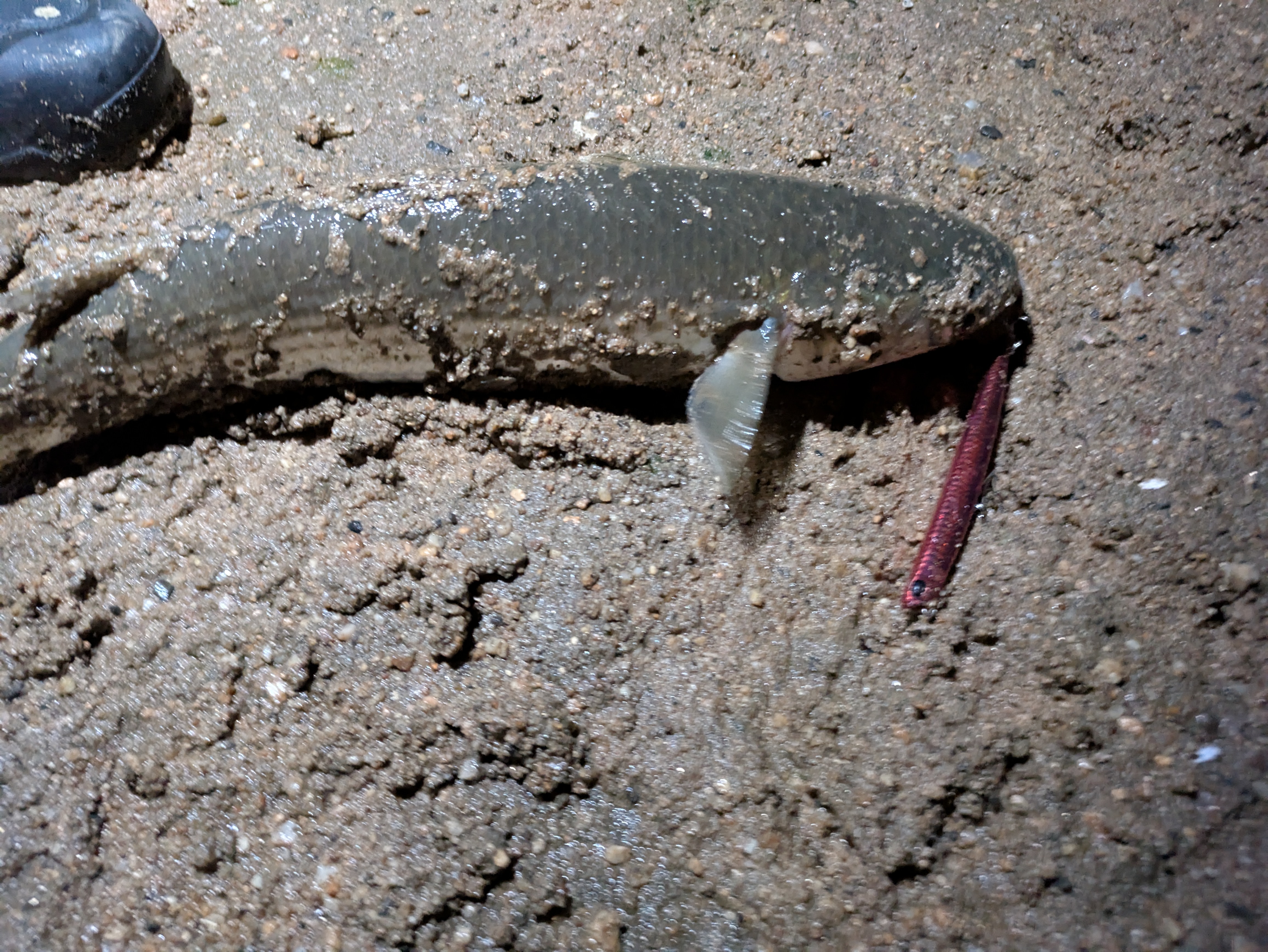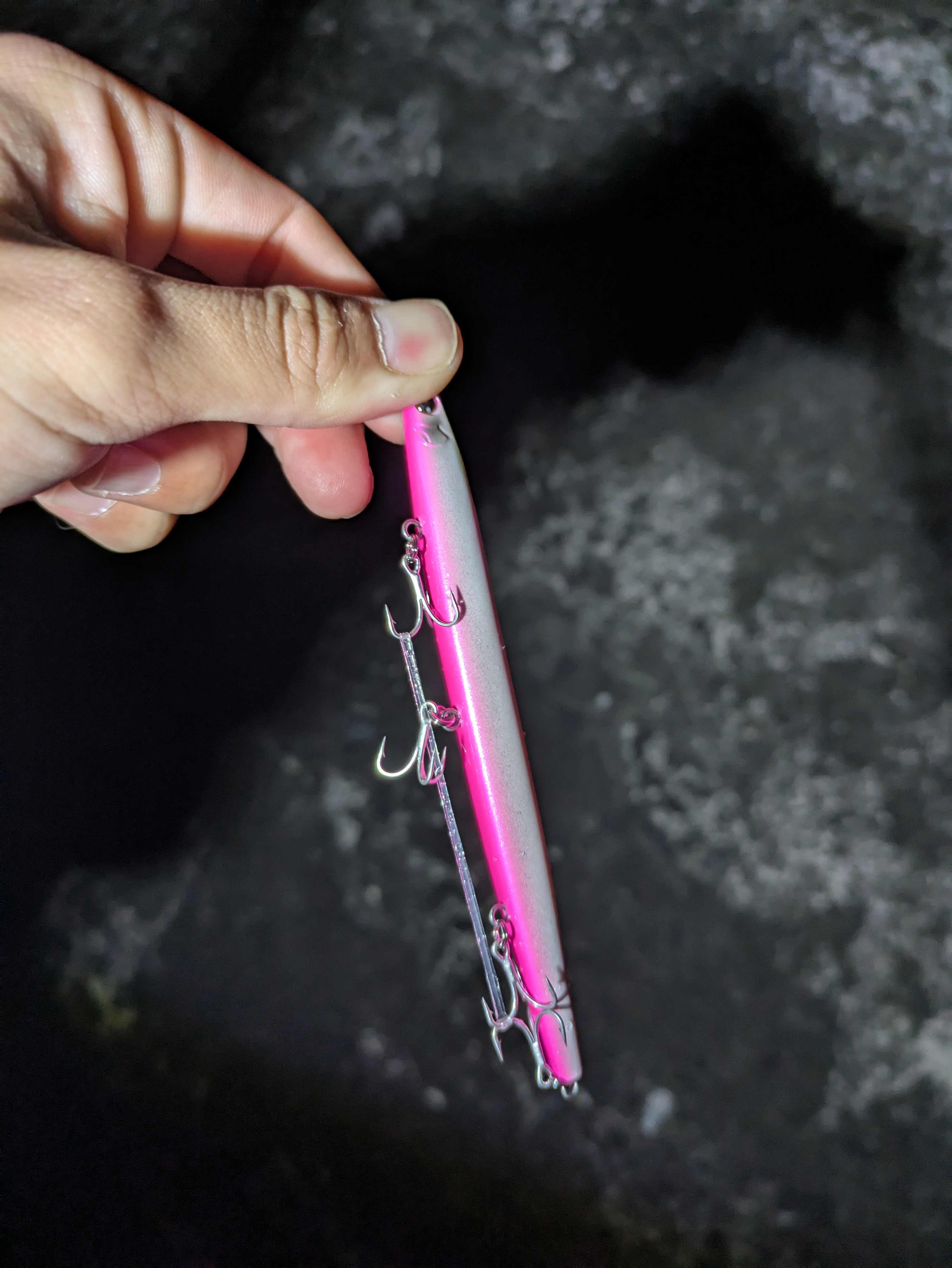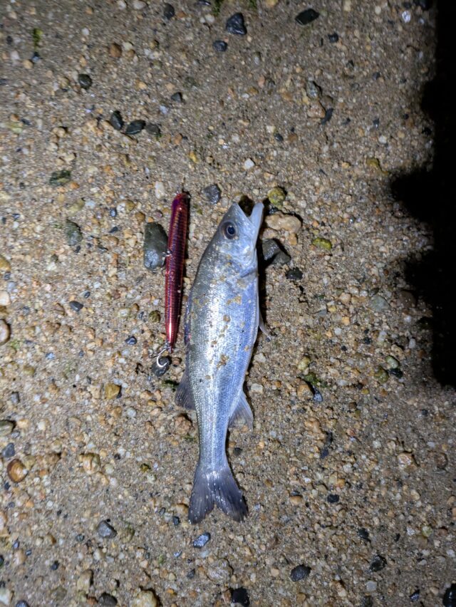 久しぶりに三重県の河川へシーバス釣行してきました。最初のポイントは満潮7時から開始、下げ1時間あたりでアタリがでるものの乗らないので確認すると、買ったばっかの輪ゴムがつきっぱなしでした…。その後なにもなくなってしまったため、移動して、漁港をみてみましたが、何も反応なく。漁港は次の次くらいの潮回りでよくなる気がします。もう一箇所ポイント移動してみると気配ありやってみました。手前は流れが巻いて逆方向へ流れているので抵抗の少なくて軽いバチ向けのルアーは使いづらかったので、マニック115を使用!他のバチ向けルアーよりも遥かに飛ぶので竿抜けにもなりました。上流から抵抗を感じる程のハンドルの速さで巻いてると早速ヒット。可愛いセイゴが掛かりました。かなりふっくらしていたので、口の中みてみましたが何も確認できずリリース。その後またヒットするもボラで納竿しました。次回はもう少し飛距離のでるルアーを持って挑戦しようと思います。シーズンはまだまだこれからなので皆様も是非挑戦してみてください!