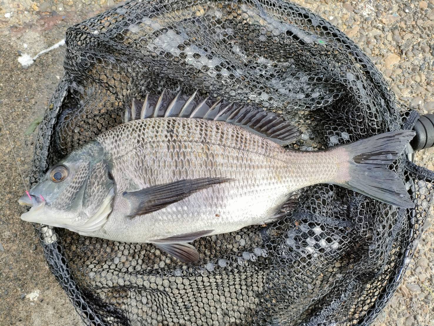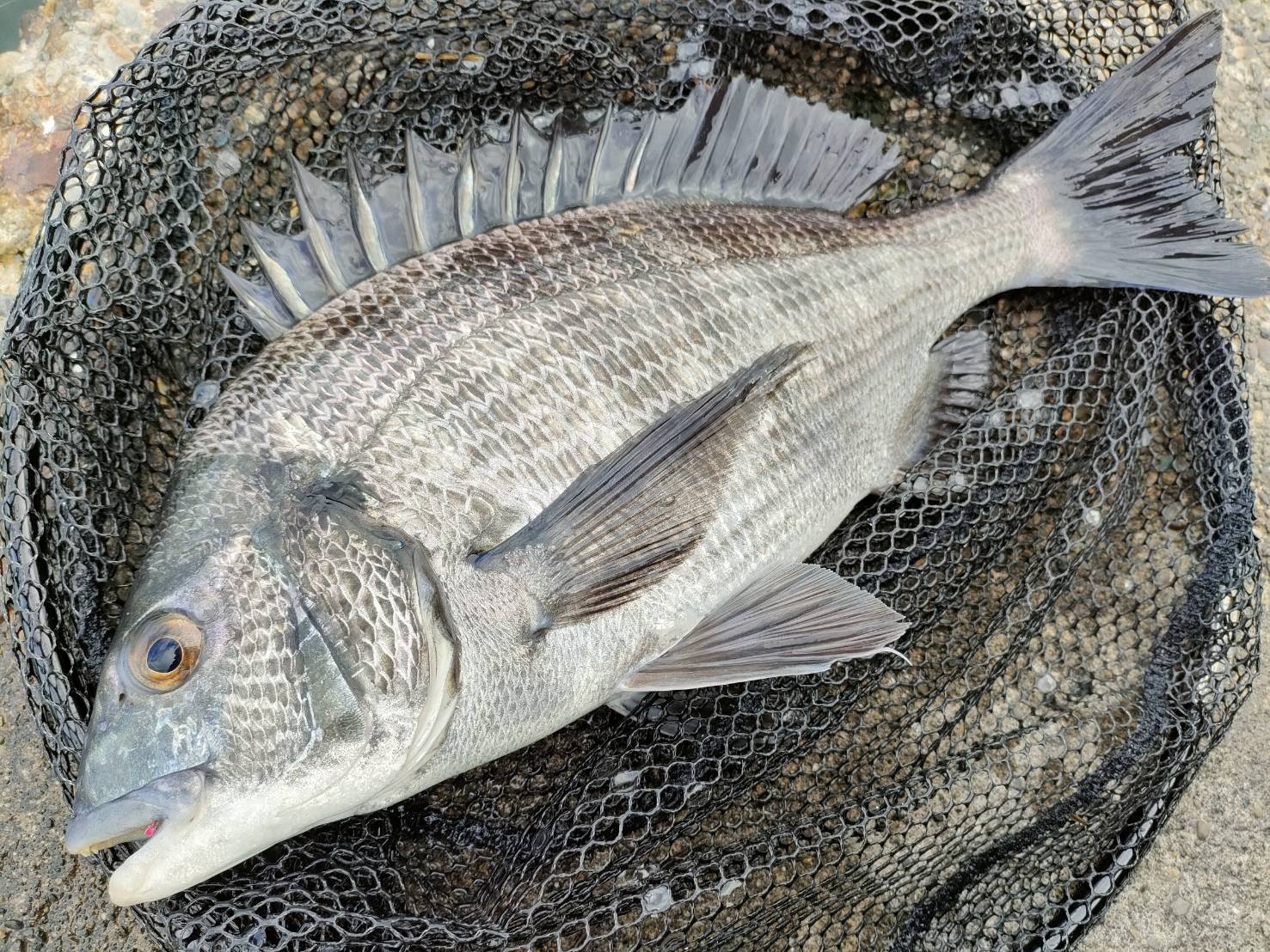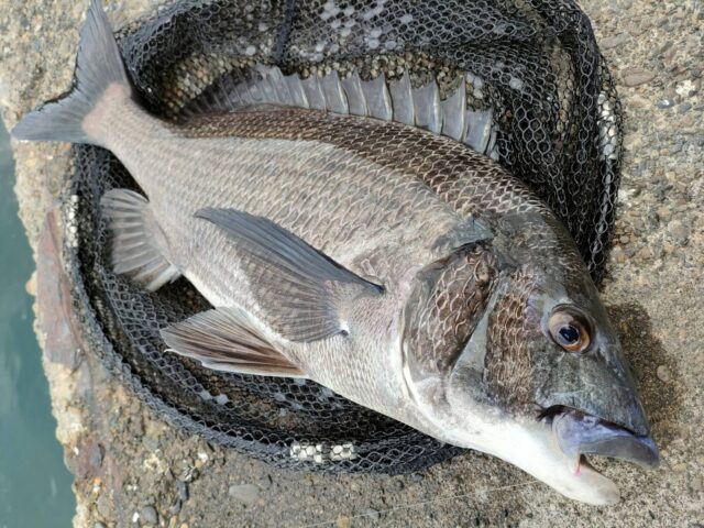 すると、付けエサが底まで到達する前にひったくるアタリで34cmのクロダイを無事キャッチ!