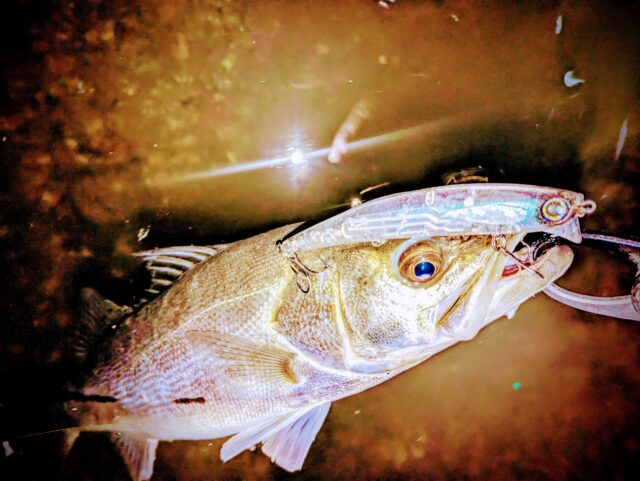 仕事終わりに名港河川にシーバス釣行に行ってきました。干潮からの上げ潮の動き出しを狙っていきます。潮が動いていない時間帯は、トップ系やウェイク系のルアーを動かしていましたが反応なく。干潮から小さな魚が水面をザワザワとしていて、群れが少しずつ入ってくると沖でボイルしていました。表層からルアーを変えながら投げていって何もなく下流の駆け上がり際をフランキーをダウンから少しずつ巻いてくるとヒット。小ぶりながらシーバスをキャッチできました!上げ潮にのってハク?が入ってきているのでそれを捕食しているのかもしれないですね。気温は低いですが徐々に春めいてきました。