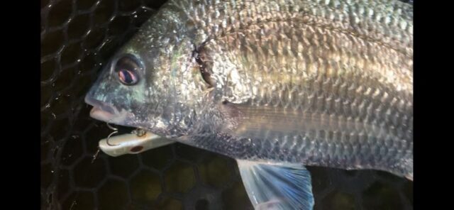 浜名湖へシーバス、チヌを釣りに行きました。下げ潮の1時間半をやりました。開始3投目でシーバスがヒット。サスケSF75で水面直下を引くイメージでした。60cm弱でしたが目の前で暴れてオートリリースとなりました。その後続かずチヌ狙いに切り替えてスーサンをゆっくり引いているとキビレをキャッチ。ランガンしながらローダーションしてパンチラインカービーでキビレを追加して終了しました。