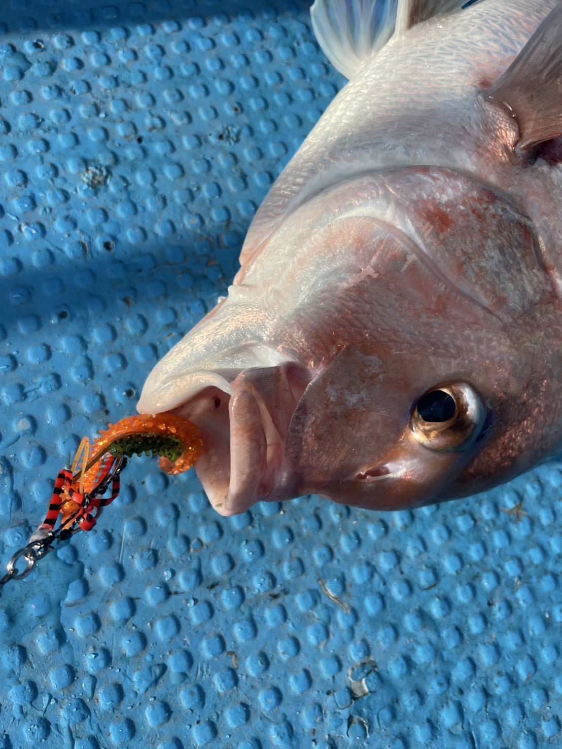 早速アタリ!強く叩かれたので思いきりフッキング!乗った!ポンピングはせずにひたすらゴリ巻きでマダイゲット!