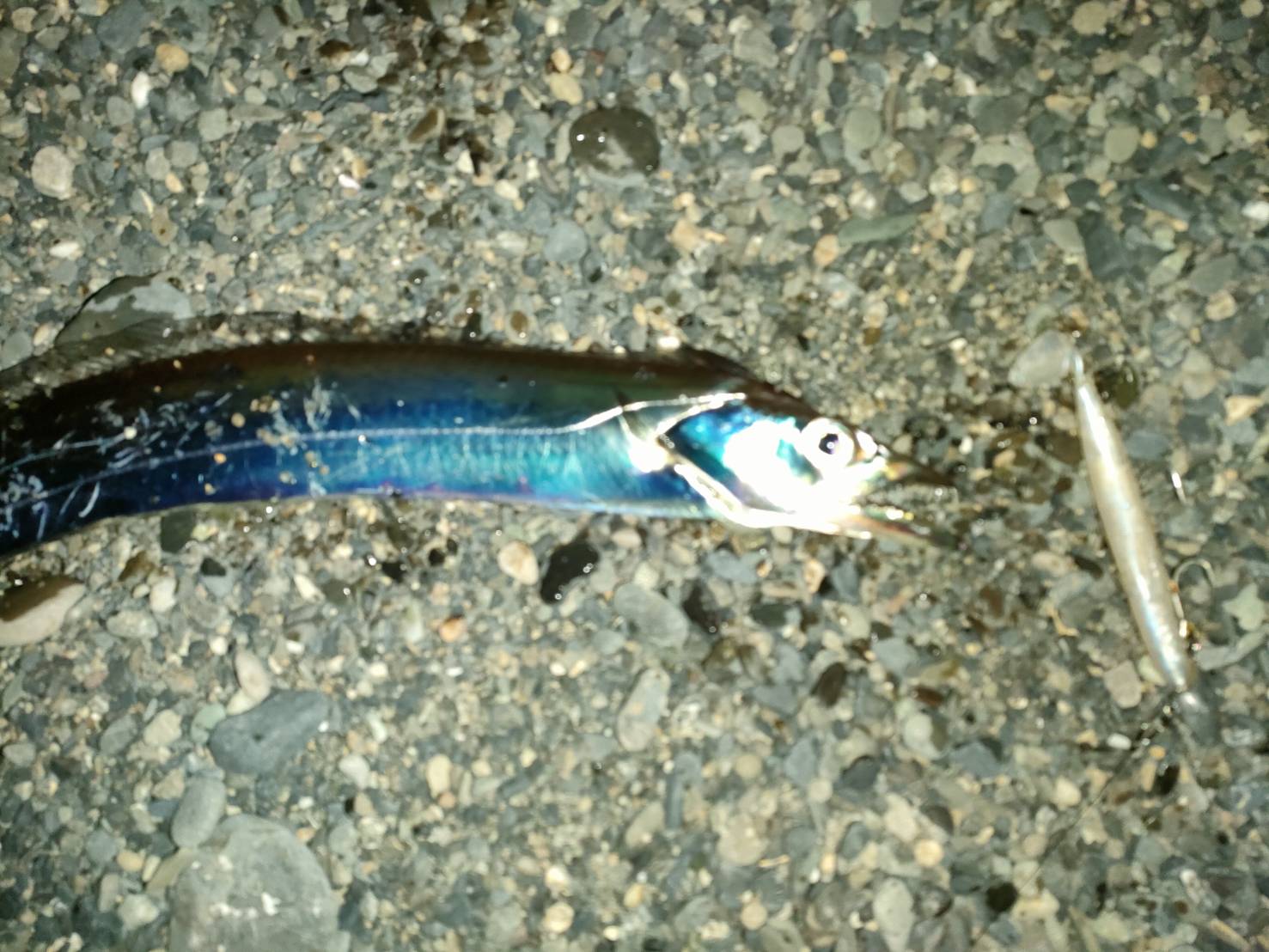 日が落ちてから少し移動してタチウオを狙うとF3.5サイズほどのタチウオがワームでヒット♪