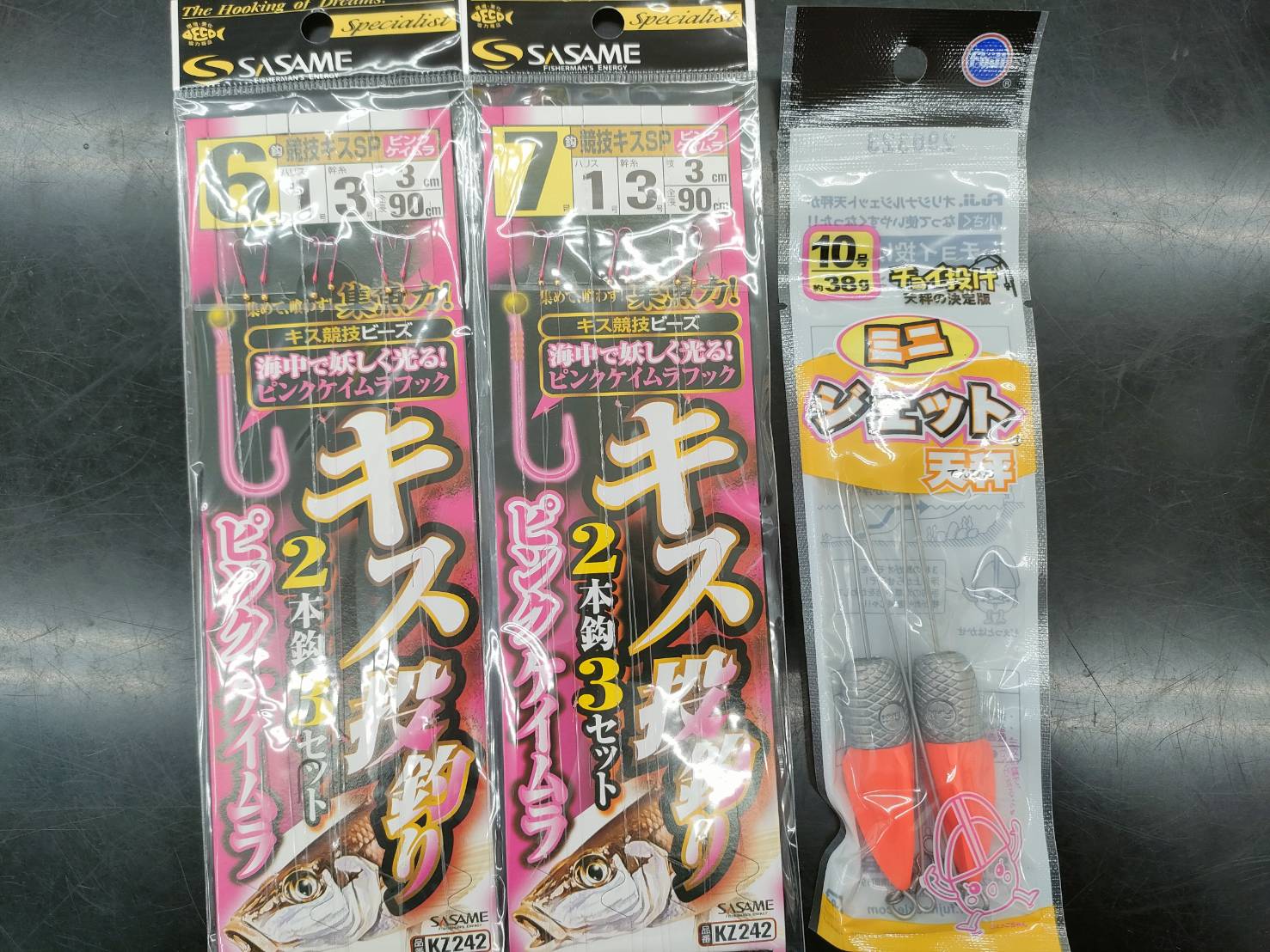仕掛は、ジェット天秤10号にササメさんの新製品「キス投釣2本針(ピンクケイムラ)」の6号にエサは赤イソメと青イソメを使用しました。