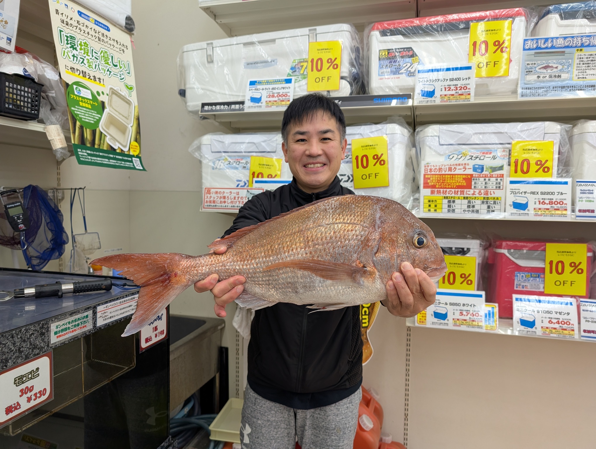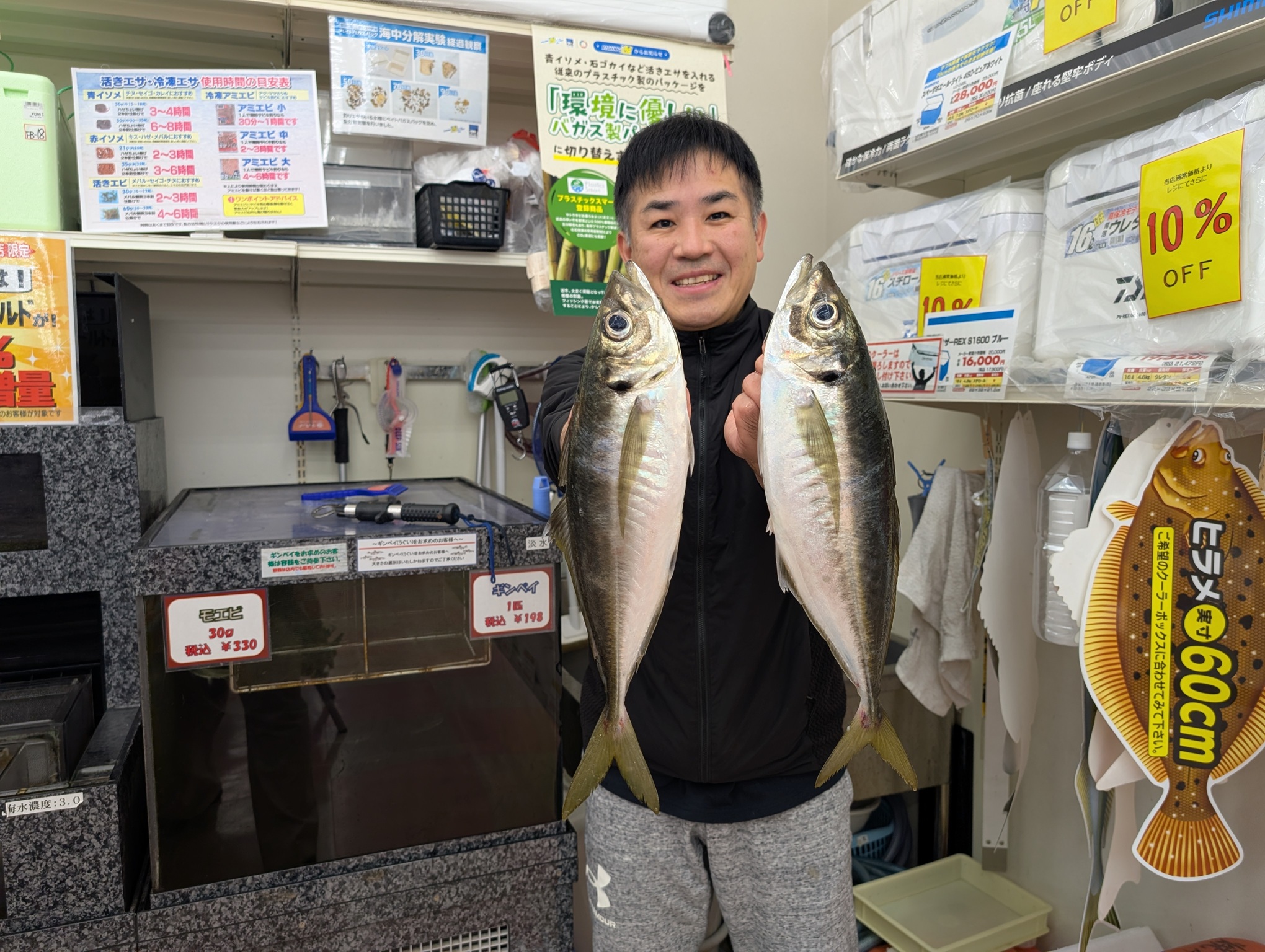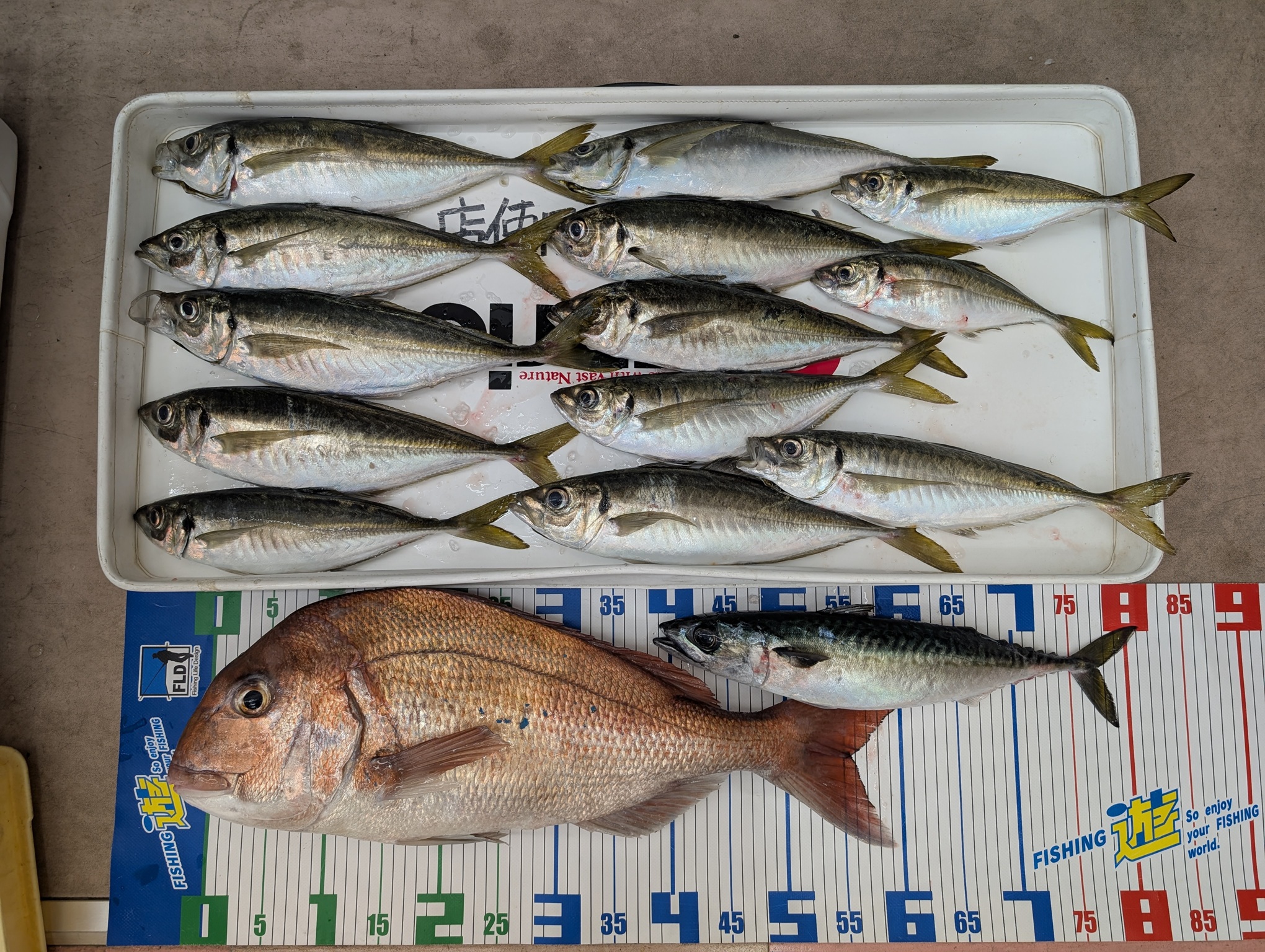 こんにちは~焼津街道店の三浦です。5/5日の夜出船の船アジ釣りに行ってきました。当日は20時に集合し、20時30分頃に出船、ポイントには21時頃には到着し、釣りを開始するも潮がまったく動かず沈黙の時間が続きます。船中ではポツリポツリと本命のアジが釣れていましたが私には配当なし。2時間程でようやく30㎝のアジその後もポツリポツリ釣れますが3時間で本命のアジは3匹。0時過ぎから潮が動き出すとポツポツ釣れだし、2時40過ぎまでに9匹追加し、アジ12匹の釣果でした。サイズは30㎝~42㎝までの良型が揃いました。その他には60㎝を超える真鯛や良型のサバも釣れ楽しい時間を過ごすことができました。夜のアジ釣りはやっぱり良型が揃いますね。5月中にもう一度行きたいと思います。