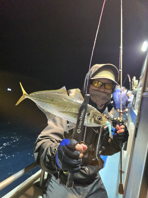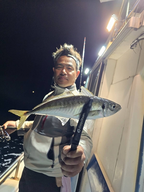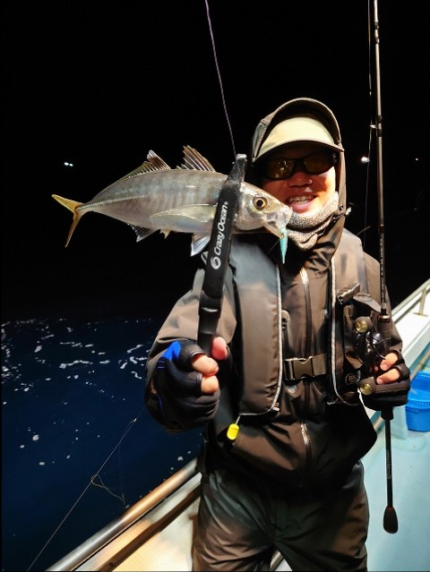 半夜釣り五ヶ所沖のバチコンでアジ狙い海桜丸さんに乗船、いい天気に恵まれ波も穏やかな日でした。ポイントについて第一投オモリは10~15号で可能なくらい潮の動きが弱い状況。暗くなりライト点灯後もアタリのない時間が続きます。しばらくしてアタリが出始めますがどうもイカ?ぽいアタリが・・それでも船中ポツポツと上がりはじめます。同船した初めての方が途中まで竿頭で早くも5匹、船酔いダウンがなければ沢山釣れていた感じです。私の方もぽつぽつとアタリが出ていいサイズのアジが来ました。棚はバラバラで底で釣れたり、上は20mで釣れたりでした。ワームは海毛虫2.5インチクリームソーダメインで使用。イサキ反応も出だしてきたのでこれからはイサキ&アジ両方楽しめそうな感じになってきました。