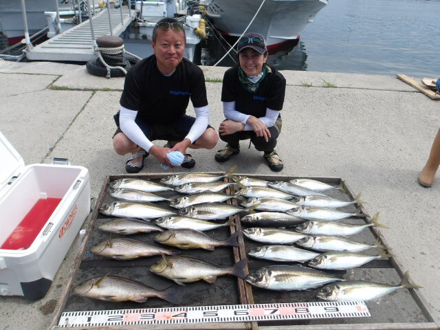 朝4時30分豊浜港を出船し大山沖に6時前に到着。数日前に網が入ったとの情報が入り気分が下がり気味でスタート。3投ほどするとアタリが!竿を下に叩く心地の良い引き!まるまる太ったイサキだ。周りでも40㌢を超える鯵が釣れ始め急に船中お祭りモードでタモを入れる姿が多く目につきました。自分にも鯵のアタリが!口が切らないように慎重にリールを巻き取り込むと40㌢を超えるしっかり脂ののった鯵でした。その後もイサキや鯵が釣れあまり釣れないと言われクーラーボックスを35㍑持参しましたがパンパンでした。
