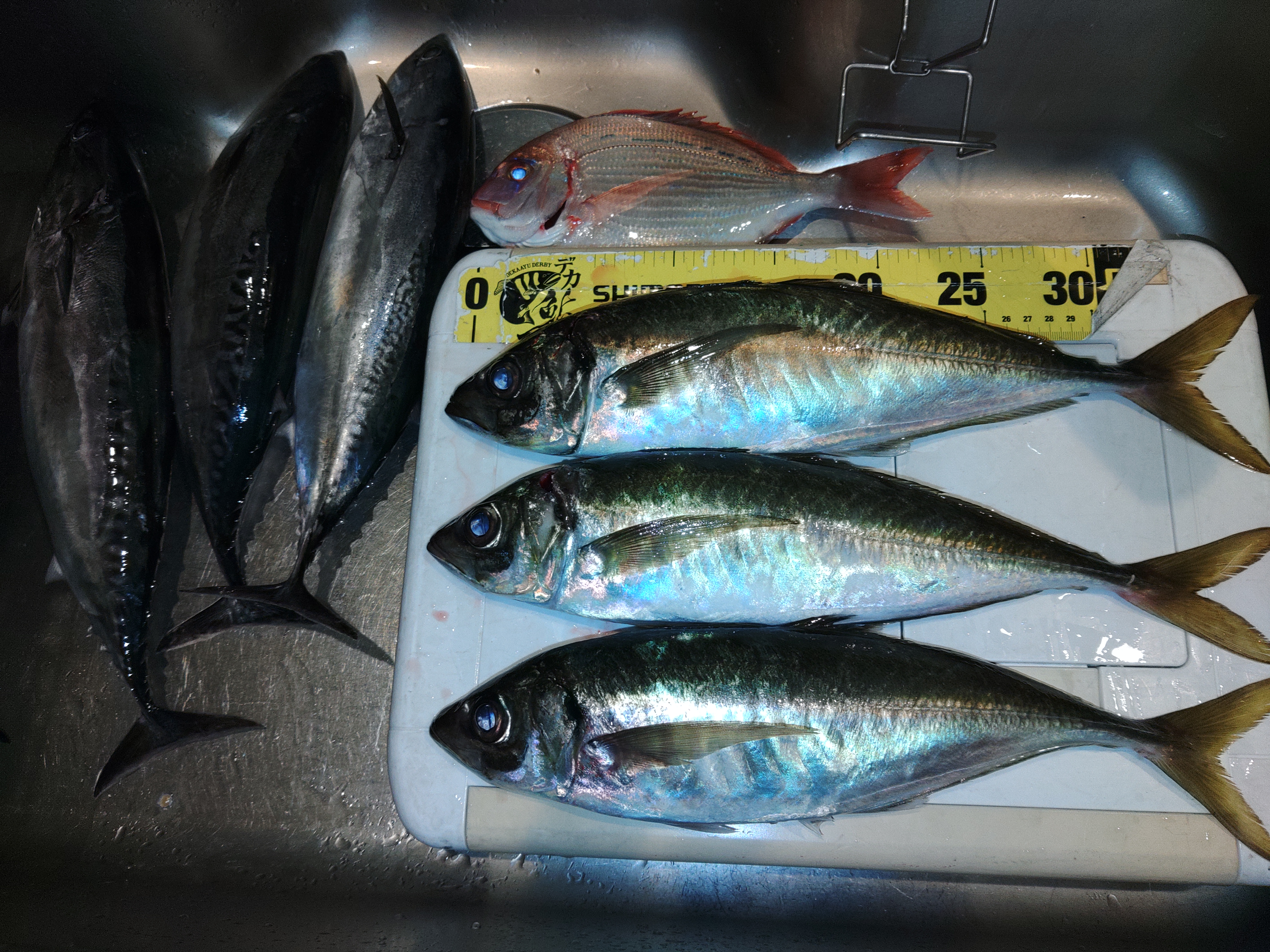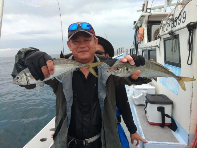 豊浜の大進丸さんへ今年初のイサキ釣りに行ってきました。 しかし、最近の情報ではイサキが釣れなくなっており、その代わりに40㎝オーバーのジャンボアジが釣れているのでそれも裏本命で狙ってきました。 港をAM4:30に出船し1時間ほど走って伊良湖沖のポイントに到着。水深33mで棚が27~28mで釣り開始。2投目で竿先に小さな当たりで、釣り上がって来たのは20㎝ぐらいのチャリコでした。その後は反応が無く2時間後に久しぶりのアタリがありましたが途中でバラシ・・・。 しかし、すぐにアタリがあり今度慎重に巻き上げ40㎝前後の大アジをゲット!! とりあえず裏本命を釣り上げ一安心。 しかし、その後はソウダカツオのラッシュ!3連発! その後は移動を繰り返し、ラスト1時間となったところで久しぶりにデカアジゲット! 2匹アジを追加したが、本命のイサキはボーズのまま納竿となってしまいました。