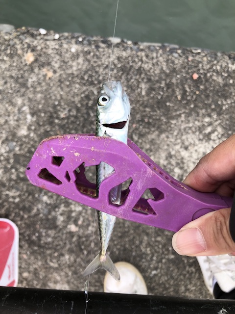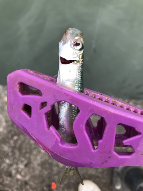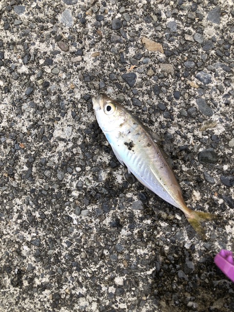 小鯖は大きくなり、その中でウルメイワシも混ざって釣れました!!1時間程経った頃サビキをあげてみると1番下に小さなアジが付いていました\(^^)/