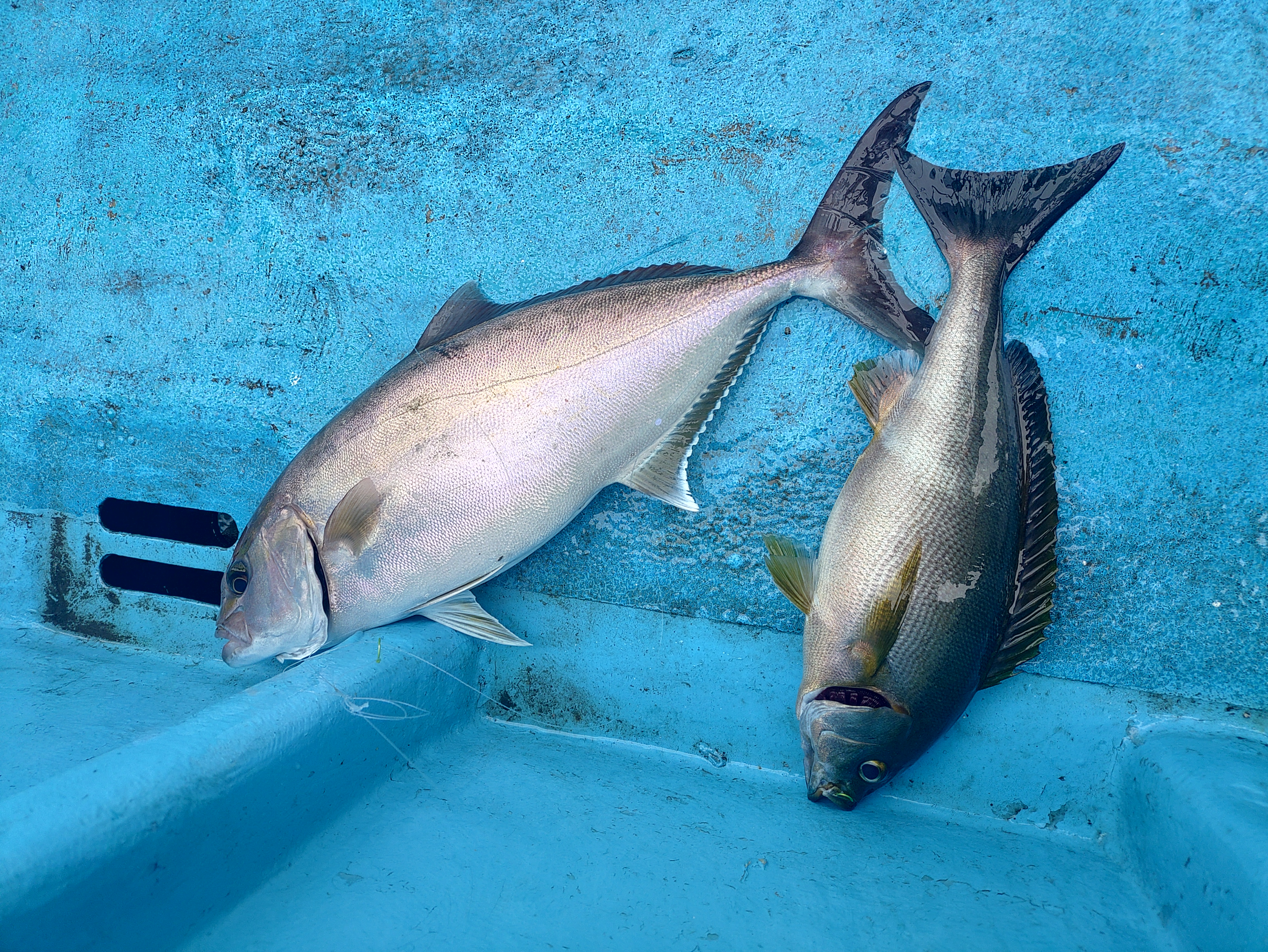 サメかななんて思いながらドラグ締めようとおもったけど慎重にやり取りすると、まさかの50センチ超えの丸々したカンパチ!その下にイサキ!