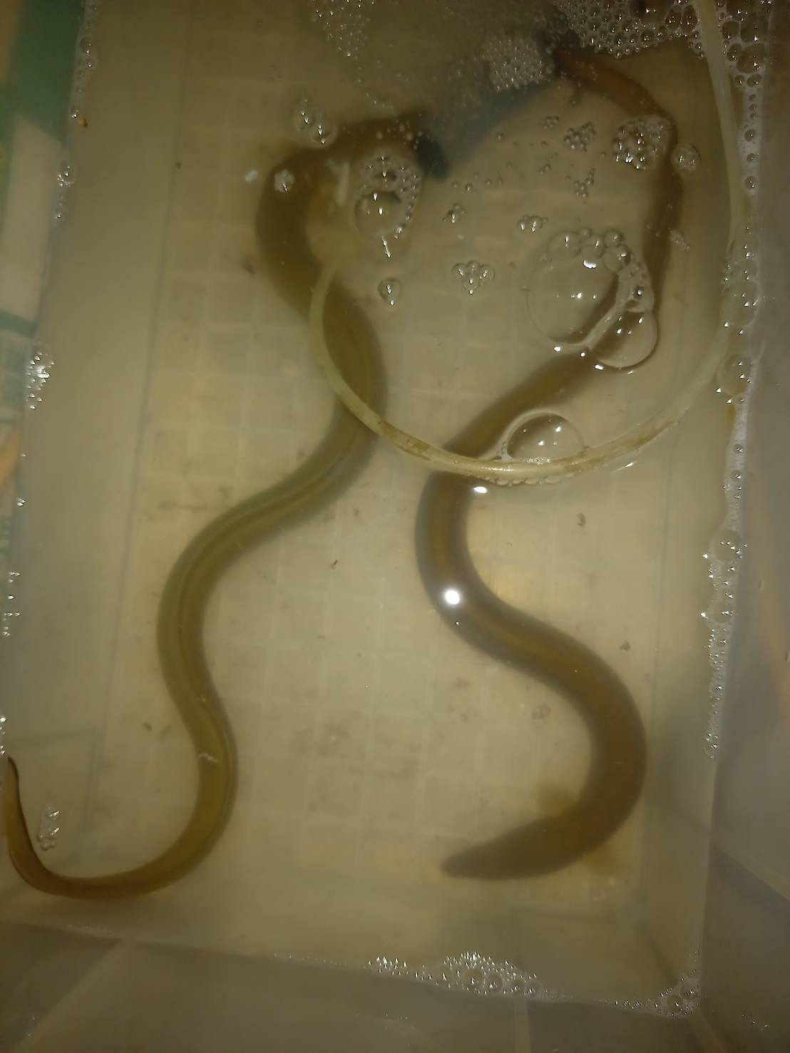 仕事が終わってからポイントまで小一時間車を走らせます。現場には20時着。竿は3本。針以外はセットがすんでいるのでさっと針と餌を付け、順番に投げ入れます。エサはアケミの剥身。まだ、雨が残っていたので、ケミホタルと鈴をセットしたら、車で待機。アタリなく、30分が過ぎ餌の付け替え。雨もほぼ止んだので、外に出てアタリを待ちます。時折弱々しく鈴がなるものの本アタリは出ない。エサ交換しようかと巻き上げようとした瞬間に別の竿に激しいアタリ!これはもらったでしょう!!上がってきたのは本命!良型天然ウナギ!あわてて水を汲み上げ活かし容器に入れて一安心。再び同じポイントに投げ入れます。程なくしてまた、いいアタリ!これも良型。21時過ぎ。潮も緩くなり、アタリも遠くなった。少し粘りましたが、完全にアタリもなくなったので22時納竿しました。