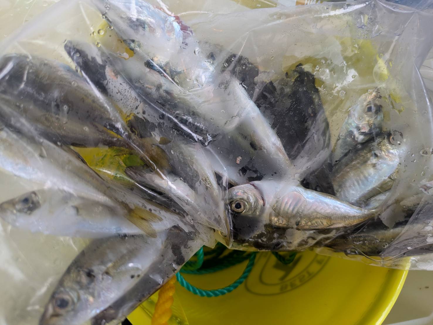 休日の午後に南伊勢へ堤防釣りの調査してきました。湾奥の堤防もふらふら見てみるとグレの小さい魚やチヌ、クロホシイシモチ(キンギョ)、アジ、ソラスズメ、サバなどなどいろいろな魚が沢山いました。サビキ仕掛けを落とすとわらわら!!終始魚が見えて大変楽しめました!アジのサイズは10cm前後のサイズで南蛮漬けサイズです。釣ってから料理して家族で召し上がってみてください。