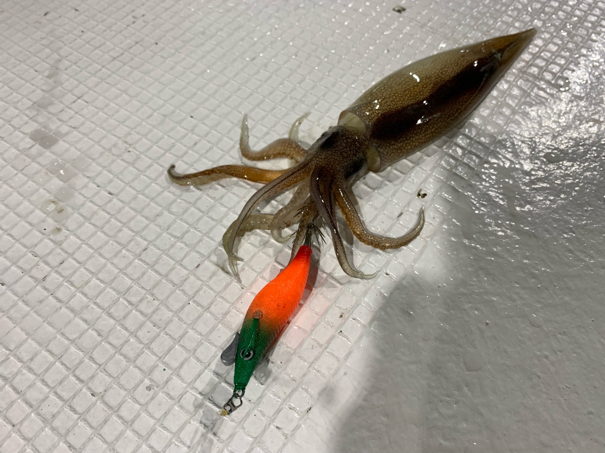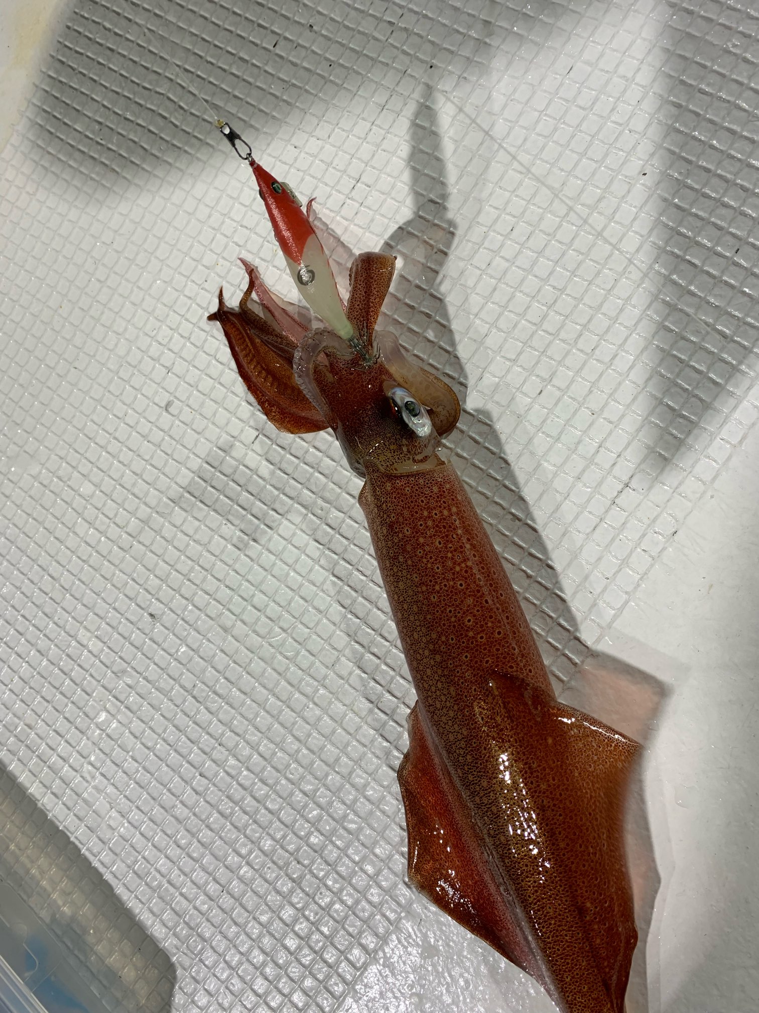 今回は水深40m程の近場の浅場がポイント。日が沈み漁火が炊かれるまではアタリがありませんでしたが、19時半ごろに1杯目をゲット!ヒットしたのはクレイジーオーシャンのハードパンチャーV1.8号のレッドホワイトで、ボトムベタ底でした!