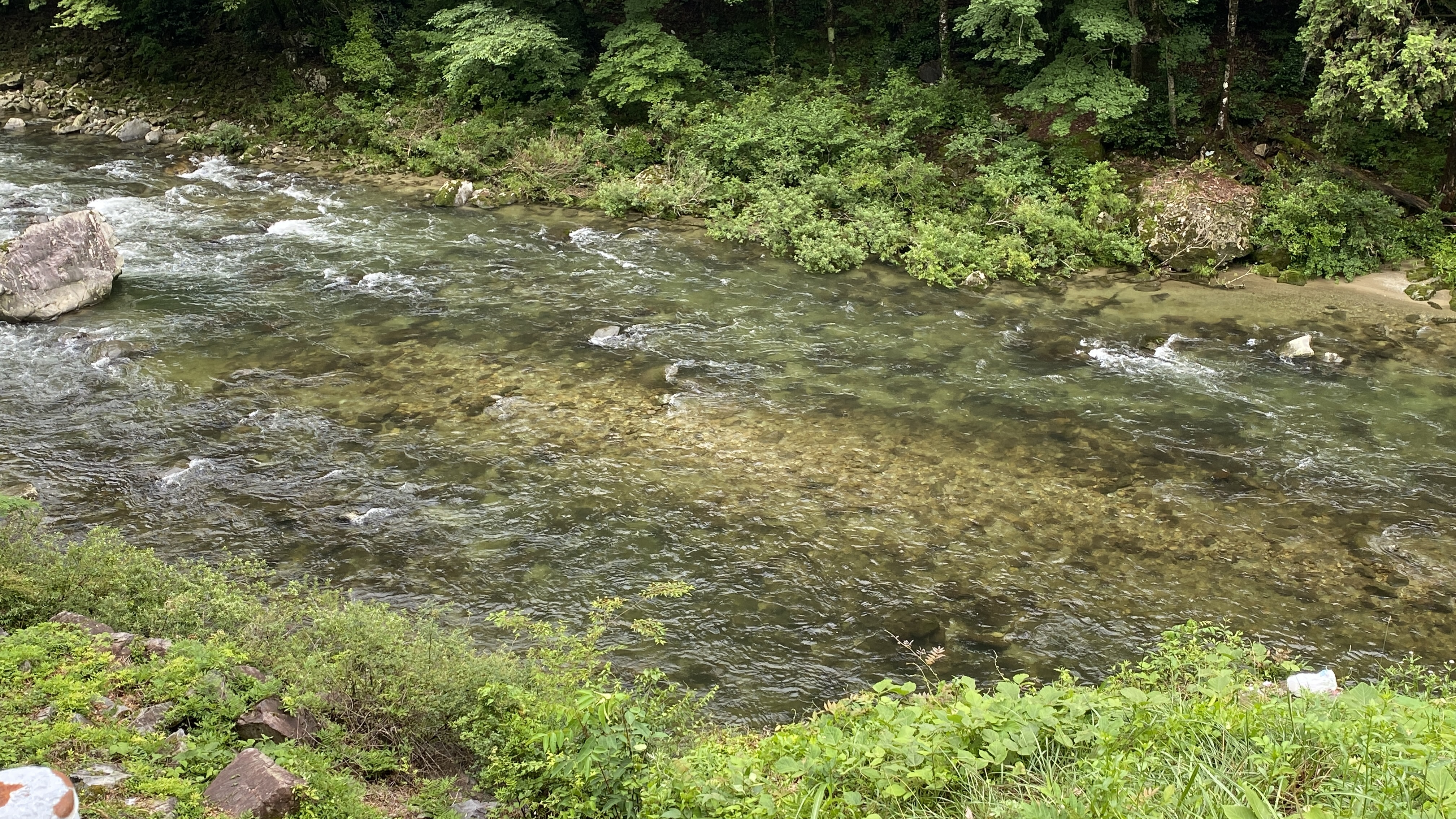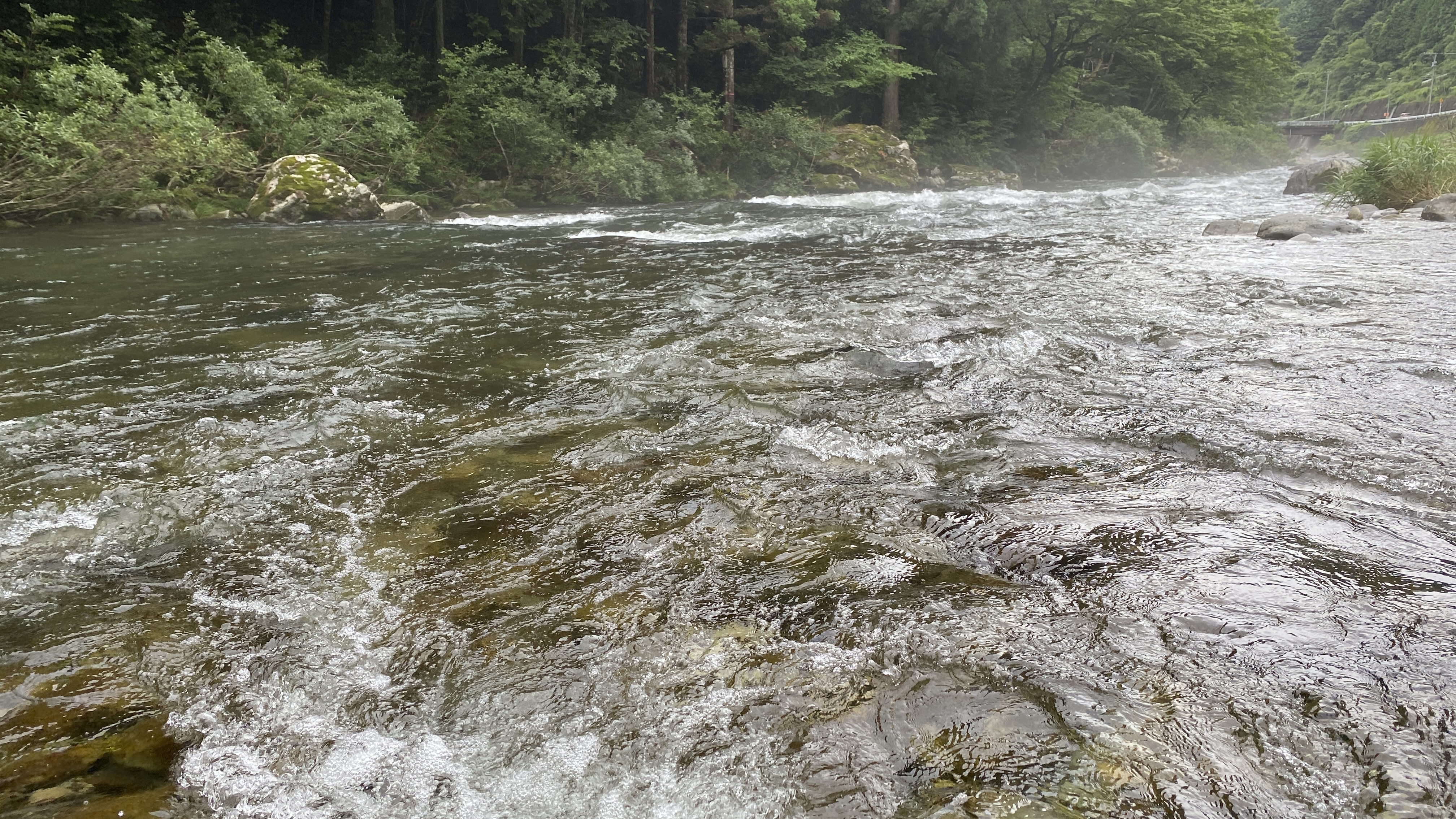 11時頃から2時間程度の実釣。前日の雨で水位は30~40㎝増。人気の東白川村の越原橋下流から始めます。