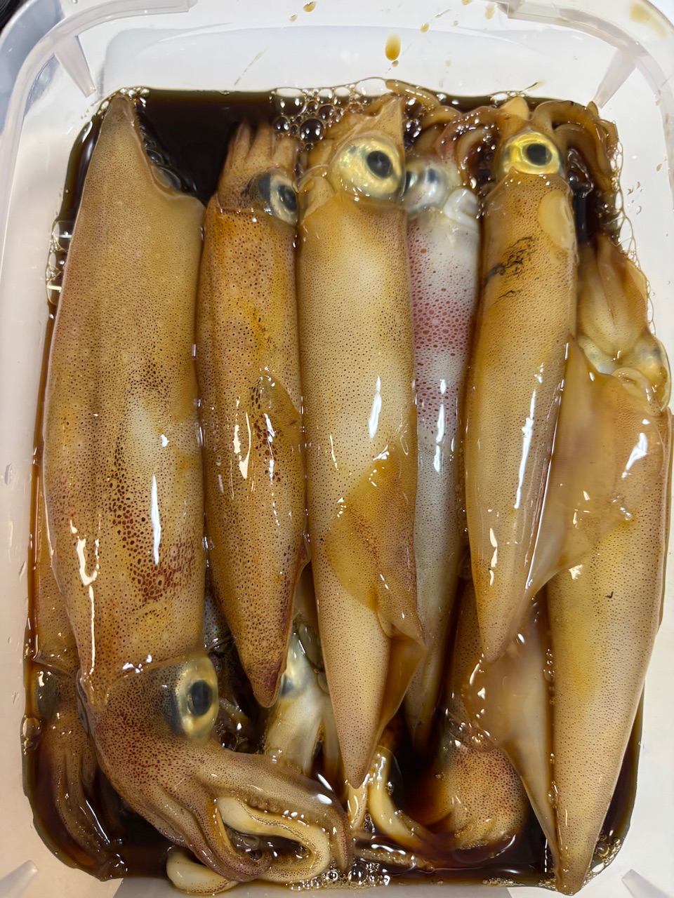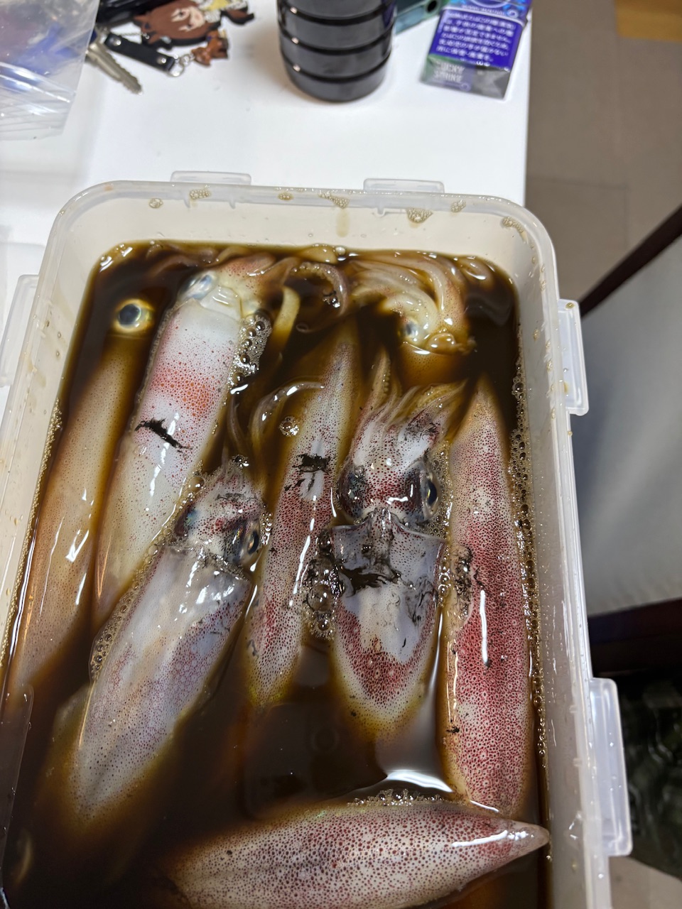 今が最盛期のイカメタルに行ってました♪お世話になったのは敦賀ICから5分の一美丸さんです!この日も暑かったですが夕方からので幾分暑さも和らぎました。ポイントまで1時間弱、ポイント到着しました。最初使用したスッテは25号のメタラーの新色ニンジンカラーとハヤブサさんのハグハグドロッパーです♪開始直後にすぐアタリましたがサバでした(笑)漁火を焚き始めて効き始めるまで色々なタナを探っていきましたが中々アタリが遠く苦戦。ボトムで再度アタッたのですが痛恨のバラシ。。。中々難しいです。完全に漁火が効き始めても中々アタリ棚を探すことに一苦労しましたが27m~30mでようやく固定できるとアタリを継続できました♪スッテは話題のイカスナーに変更してようやく1パイ♪水深も浅くなってきたので今度はアニサキスッテの15号に変更しました。最初は赤白から後に赤緑に変えました♪同じタイミングでドロッパーもダイワさんのEMエギの1.8号の赤テープの赤緑!自分自身が絶大な信頼を置いているドロッパーです♪フォールのアタリでタイミングを掴んでから連発モード♪魚のアタリに悩まされながらも何とか釣りきることが出来ました!釣ったイカは殆どを沖漬けにしました♪今回はイカの笑油だれ、二度漬け用のニンニク醤油、そして味噌ダレでやりました♪味噌ダレはズバリ!エバラ焼肉のタレ♪どれもイカの味に非常にマッチしますよ♪釣ったイカを美味しく食べるためにも是非やってみてくださいね!
