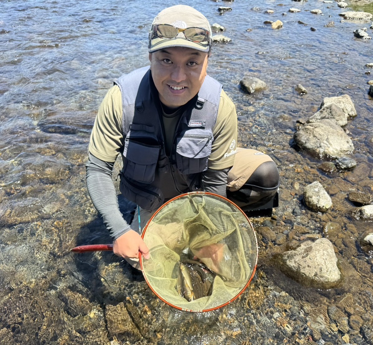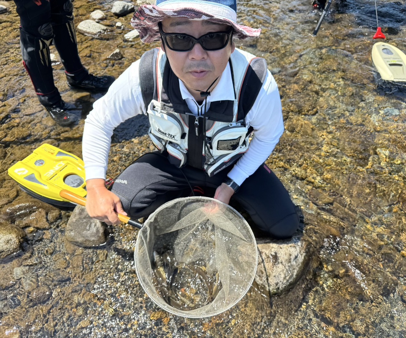 今回は、社内の有志で『大人の遠足』。1日目は滋賀県の安曇川へ鮎釣り&温泉&バーべキュー。朽木の村上おとり店にておとりと日釣券を購入し釣り開始。渇水でひと雨欲しいところです。朝から厳しい猛暑で、1匹目がなかなか釣れない。トロ場、チャラ瀬など移動しながら狙うもなかなか釣果が伸びず。日陰になっている淵を狙いやっと1尾。そこから下へ下りチャラ瀬を狙います。ポツポツと釣れて、早めに終了。その日の宿泊先へ移動し、温泉に入りバーベキューの準備。みんなでワイワイ言いながら鮎と肉と海鮮、野菜のバーベキューと美味しいお酒に舌鼓。いや~、最高の晩餐でした。