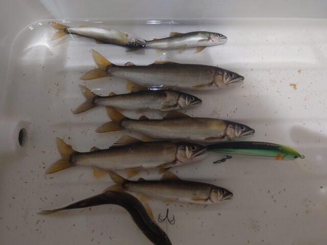 豊川にアユイング釣行に行ってきました!本日はルアーはパームス エスケードアユを使用しました!ルアーの前15cm程に0.5号のカラーオモリを打ちました、アユイングも経験が浅いので私はルアーは投げていません、10フィート竿の長さ分だけ糸を垂らして、立ち位置から、その垂らした糸の長さ分の距離で釣りをしています、スタートから好調に掛かりました、本日はあまり釣り時間がなく1時間ほどの釣りで8匹の鮎を釣ることが出来ました。鮎網も忘れたのでランディングでのぽろりとバラシす事も多かったです。涼しい河川に入って夏の日中でも釣りが出来て面白いです。