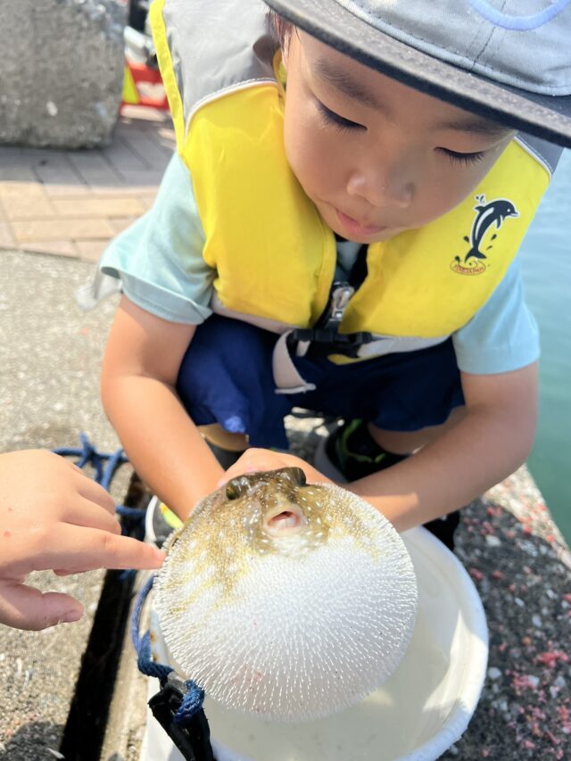 それで釣れたのが写真のアカハタと大きなフグでした!フグは観察してリリース。アカハタは小さかったですが、食べたいそうで刺身にして長男が1人で食べました。