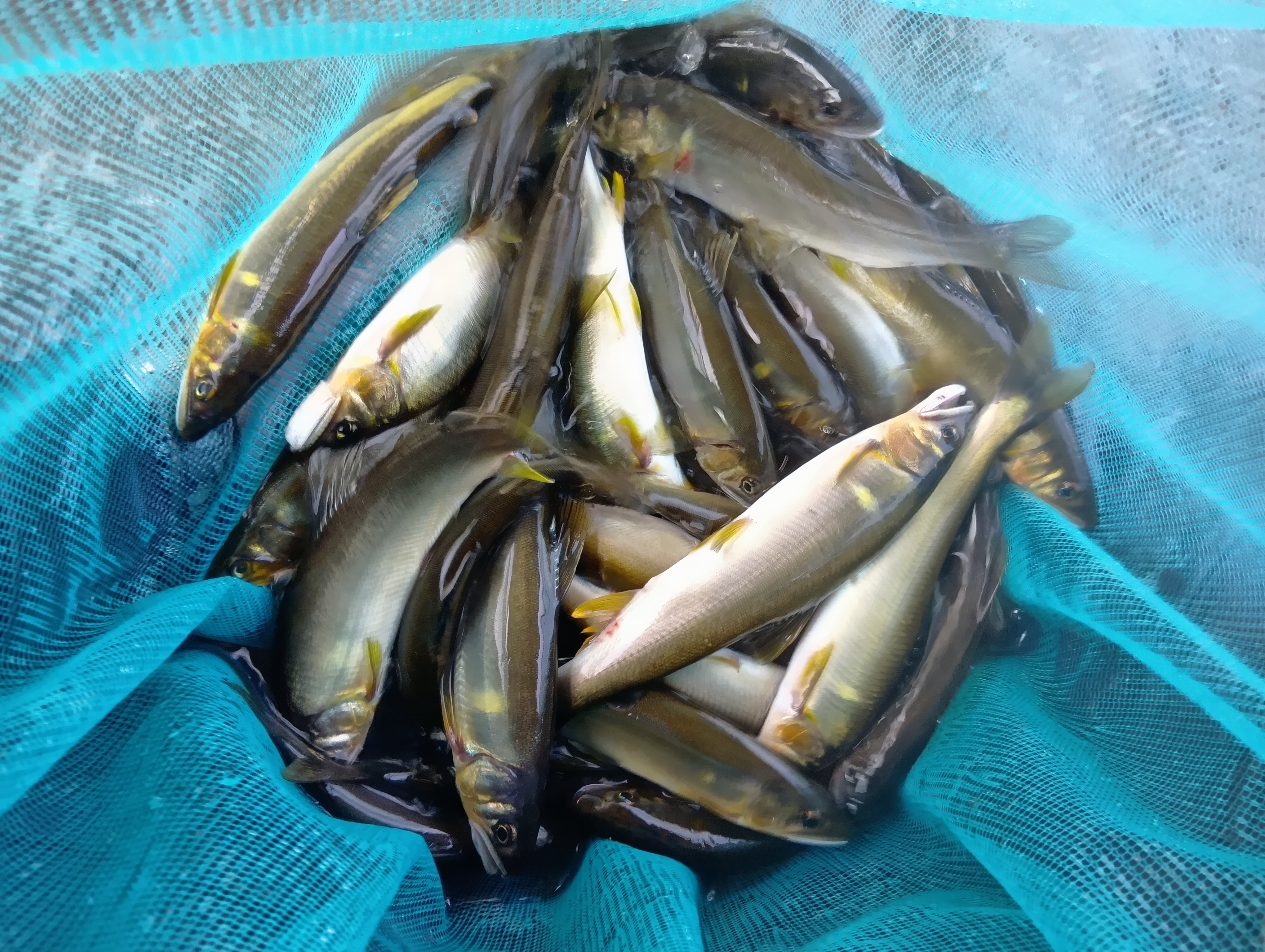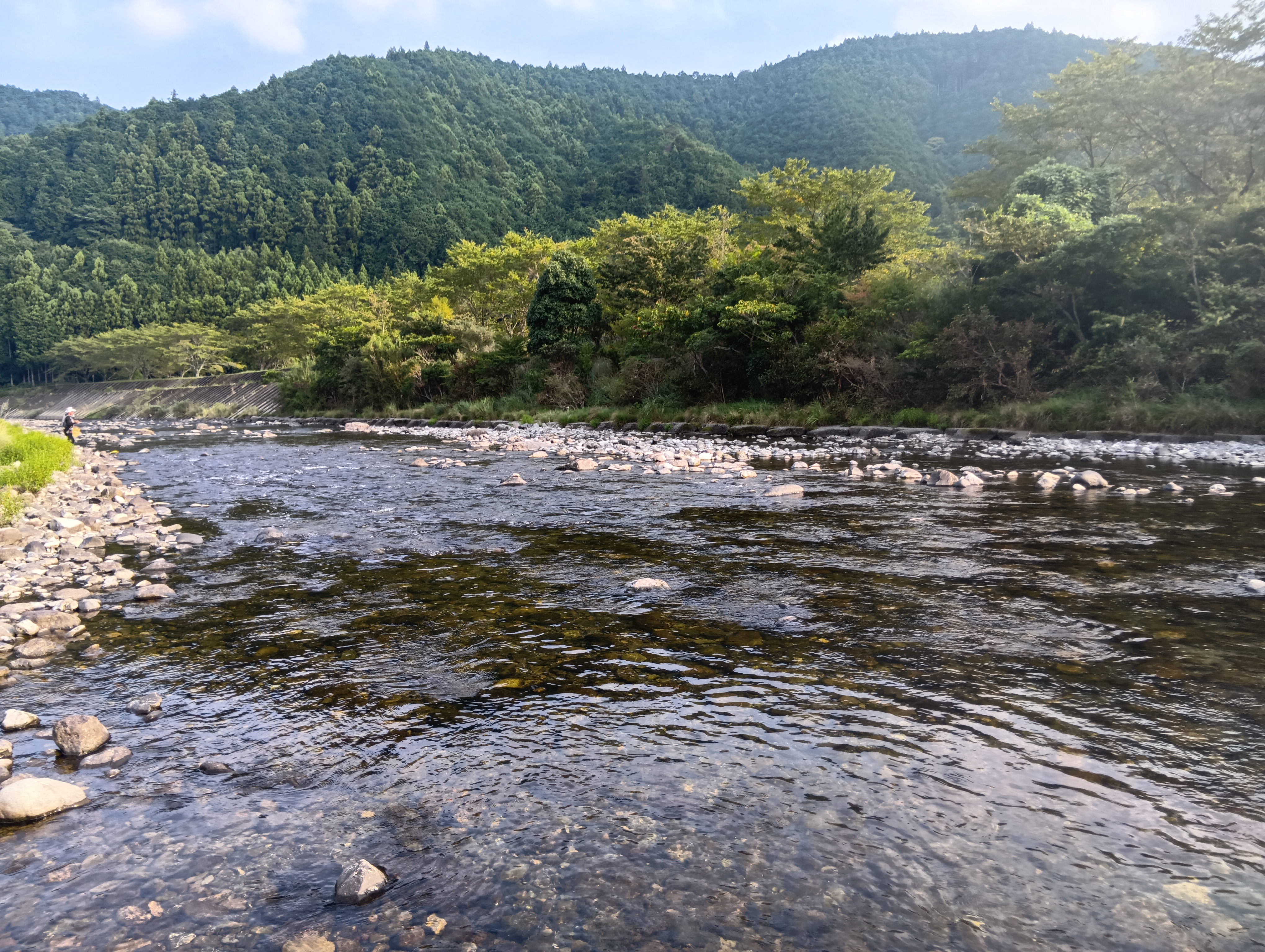 大内山川の鮎釣りです!相変わらずの渇水&高水温です。朝一7時に平瀬橋へ。朝でも川はぬるく、友カン内の水温と大きく違うので20分ほど水合わせ。この時期はこれ大事です。渇水で石の露出が激しいですが、鮎はめちゃくちゃ見える!泳がせるとすぐ掛かりました。先週より遥かに追い気もあってアタリも強く良い感じ♪ポンポンといい感じ釣れてましたが、少し沈黙が続くとストップしてしまう…そして一匹釣れるとまた数匹釣って沈黙…鮎は多く追い気はありますが、個体差激しく追い切ってはない感じ…天然遡上の小型も多いです。昼休憩を挟んで14時半に岩船橋に移動。鮎はあまり見えませんが、トロ場泳がせるとオトリごとぶっ飛ぶ良いアタリ!連発はしませんが、凄いアタリで数匹釣れて16時半に納竿しました。
