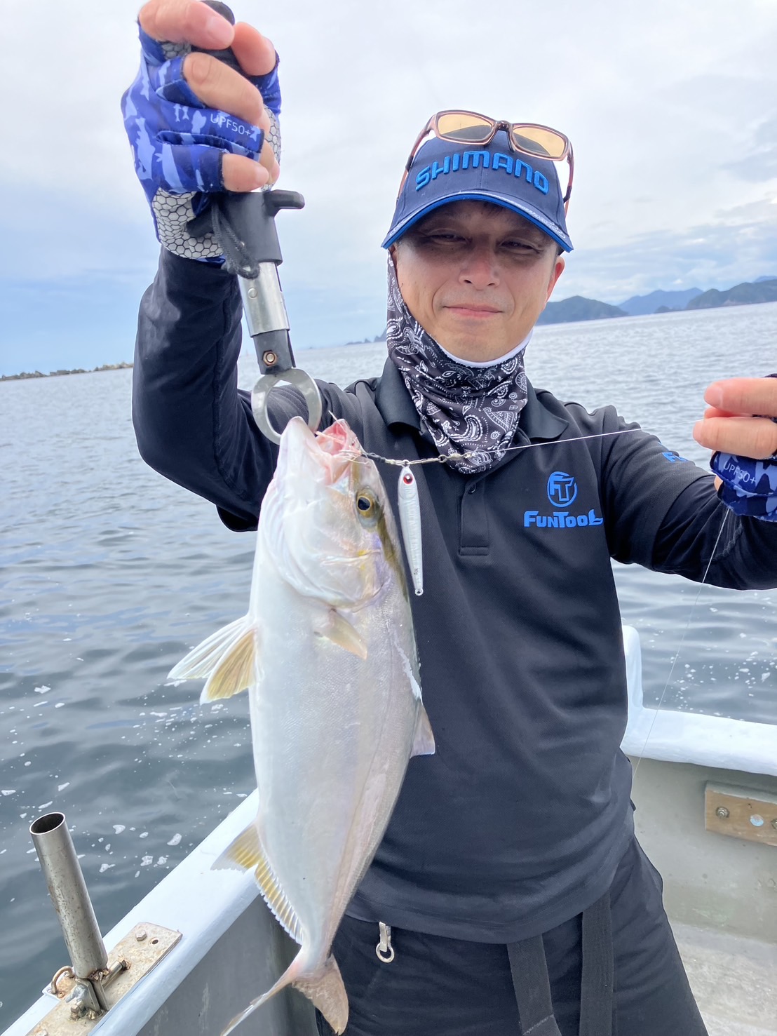 ……当たらん……予想以上に当たらん。岡田氏はカサゴ、アカハタ、エソなどを釣っています。たまに、イナダのチェイスがあるので、岡田氏はジグに変更。レクチャーしようとしたら、着底で良型カサゴがヒット!その後、岡﨑店の竹田君はジグでイナダ釣り。最後の最後のポイントでようやくアオリイカ2杯ゲット!ジグでシオも2匹ゲット!なんとか形になりましたが、久々に手にマメができるくらいしゃくってしまいました。阿曽浦方面もテイップランの開幕は9月下旬ころ。また、リベンジします。