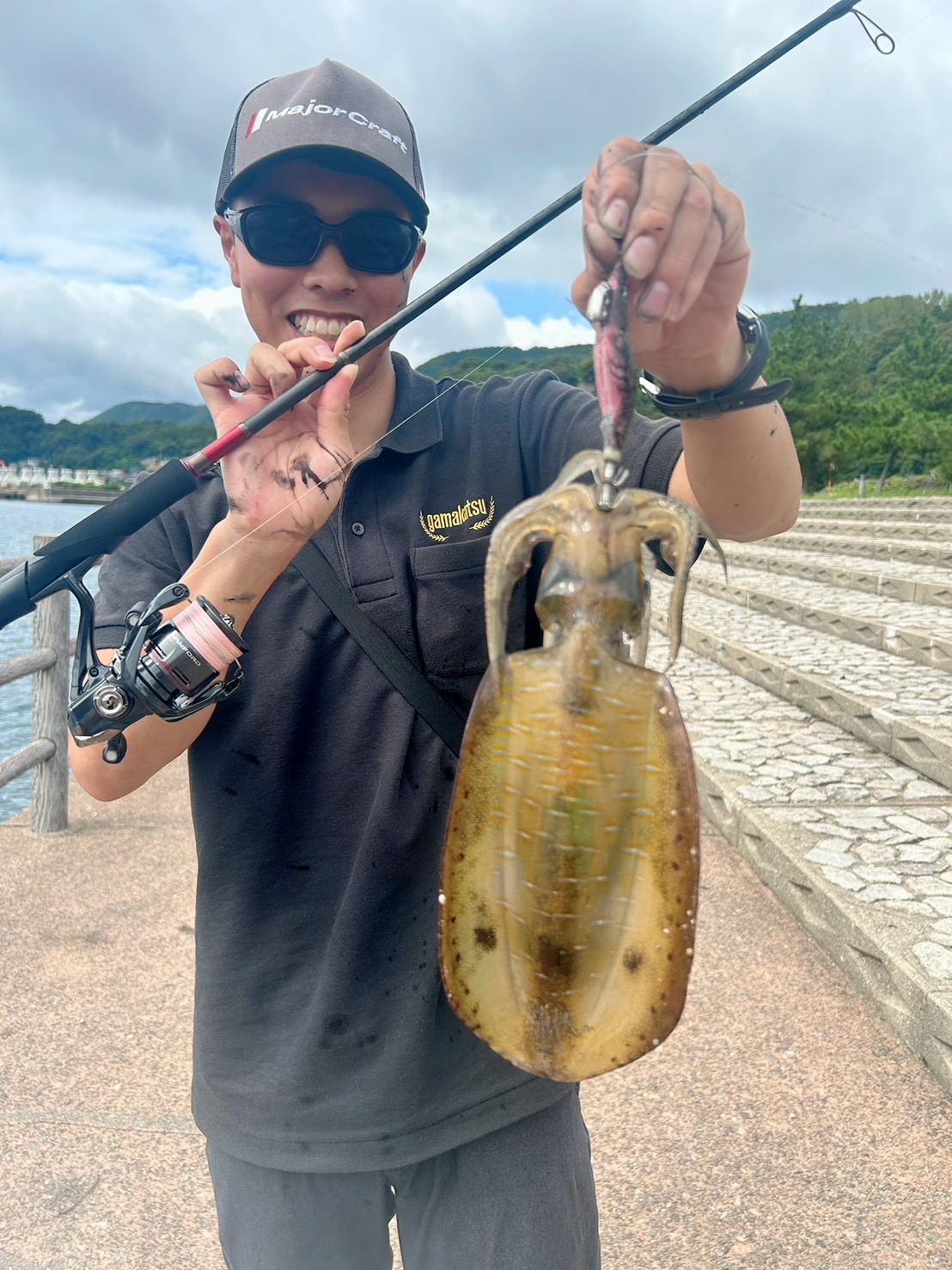 到着すると小型のイカが見える状況。期待しますがあまり活性が高くない。そこで遠投してボトムを丁寧に探って狙っていると、隣でヒット。秋イカサイズですが、嬉しい1杯で開幕!