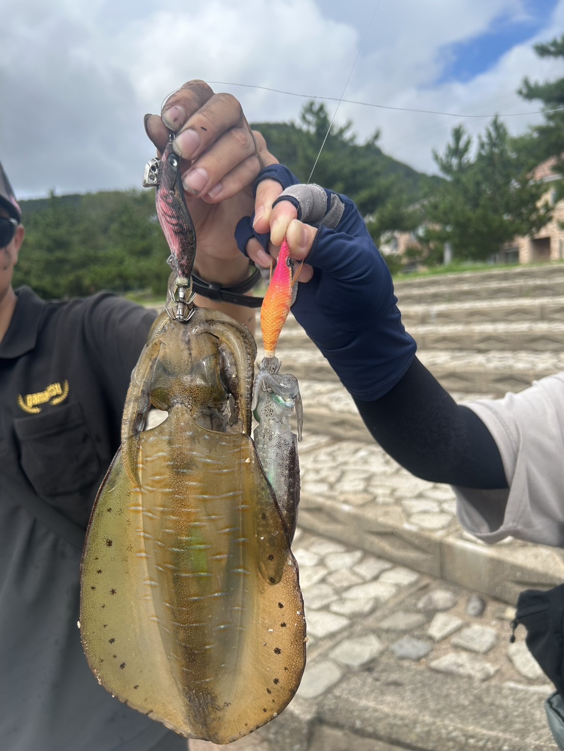 その後も当店阿部が連続してヒット。私もまだかとボトムを中心に5回しゃくりあげて10カウントテンションフォールを繰り返していくと、引ったくっていくあたりが!?秋にしてはナイスサイズの300gほどのアオリイカ。