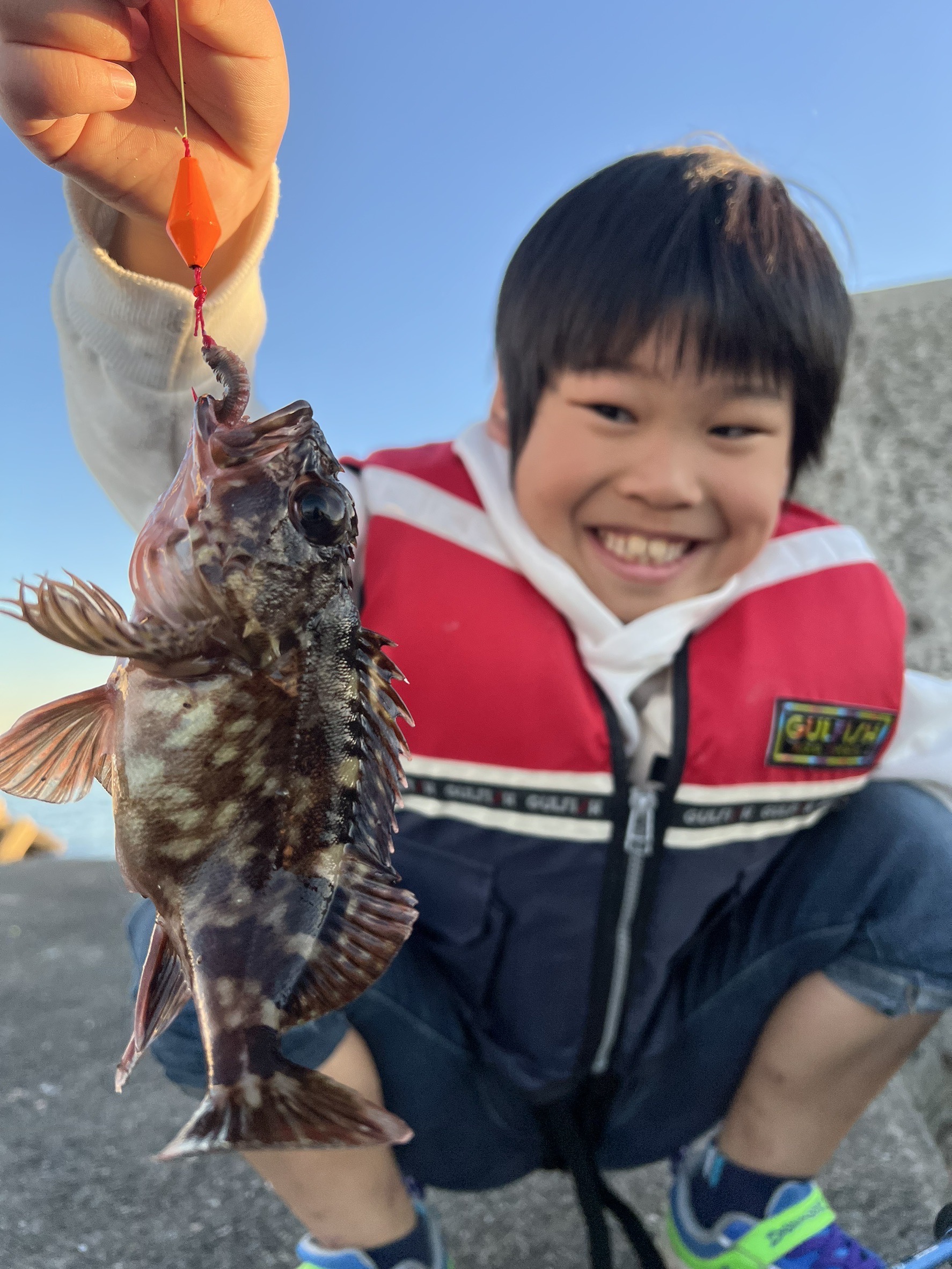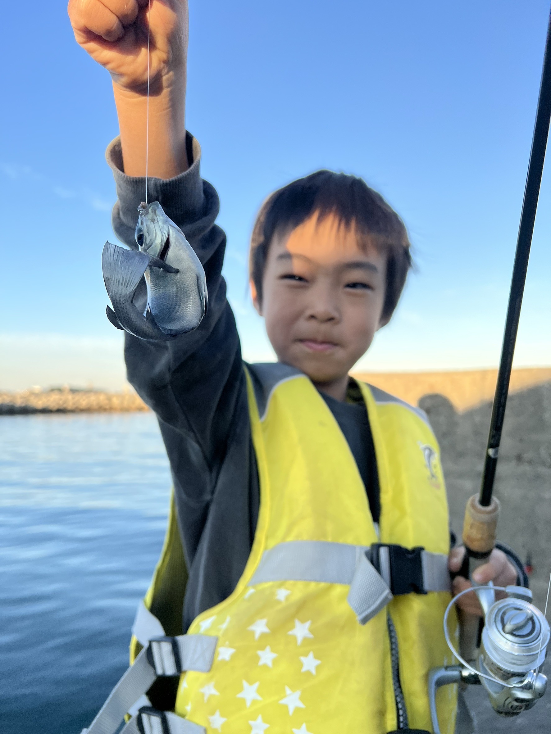 長男は釣りに慣れてきたようで、ブラクリにアオイソメつけて一人で堤防を探ってました。20センチほどのカサゴを釣ってました!次男と三男はウキでグレ狙い。堤防の際を狙います。小さいグレですがウキを沈めてくれて3匹釣れました!