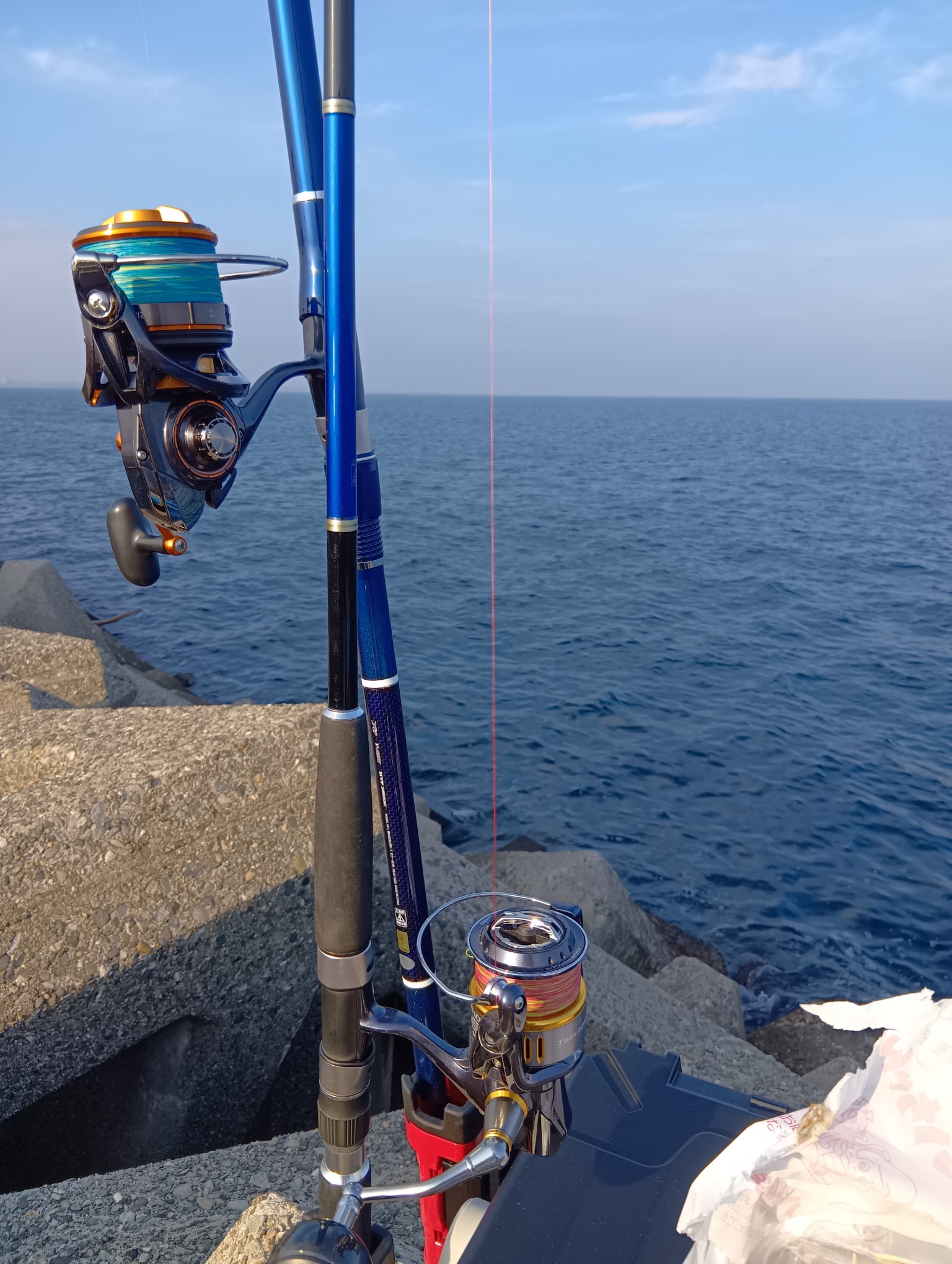 開始1時間アタリもなく過ぎてしまったので場所を大きく移動しました。片方の竿を投げ込み。もう片方の竿の準備しているとあたりが!こんなにすぐにあたるものなのかとワクワクしてあげてくるとフグ…。もう一本のほうにも小さいながらあたりが