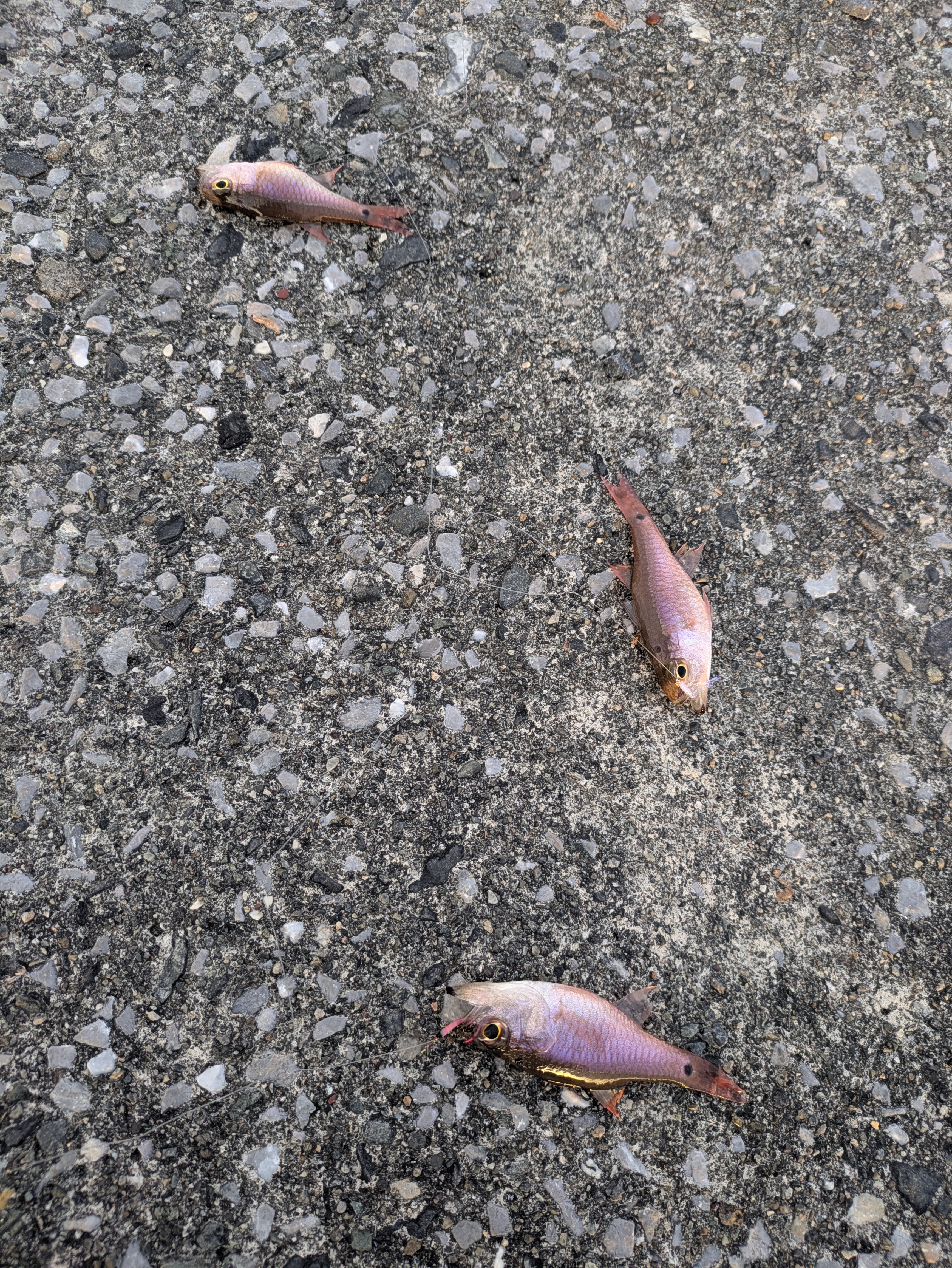 ルアー釣行の帰宅前に。サビキ釣行してきました。お昼14時頃に始める予定でしたが、昼寝で寝過ごしてしまいました。釣行開始は16時!仕掛けは、最強!小アジサビキ仕掛け7号にワンタッチフタカゴを使用し、エサはアミエビ小に、配合エサを少しまぜたもの(コマセ)を使用しました。早速、コマセをまくとわらわらと魚が寄ってきます。サビキ仕掛けを落とすとすぐに鈴なりでとある魚が!!海の金魚といわれるネンブツダイでした。夕方ごろになるとさらに活性があがりめちゃくちゃ釣れました。お昼ごろはアジが釣れていたとの事。夕方になってネンブツダイの活性が高くなって釣れづらくなったのでしょうか?また日中に調査してみたいと思います。