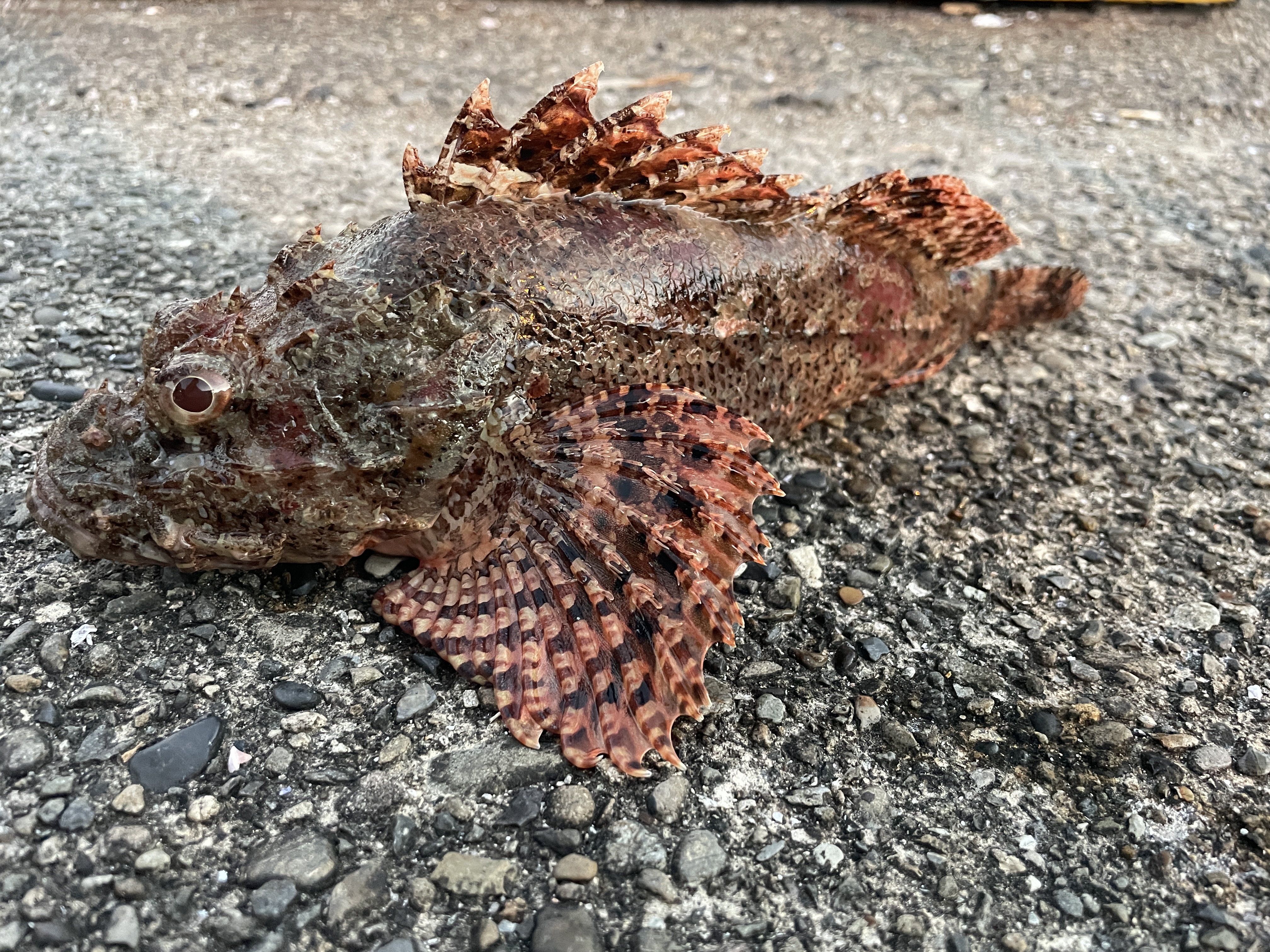 上がってきたのは良型のカサゴ!かと思いきやなんかトゲトゲしてる!まさかの30cmを超えるオニカサゴが釣れました。