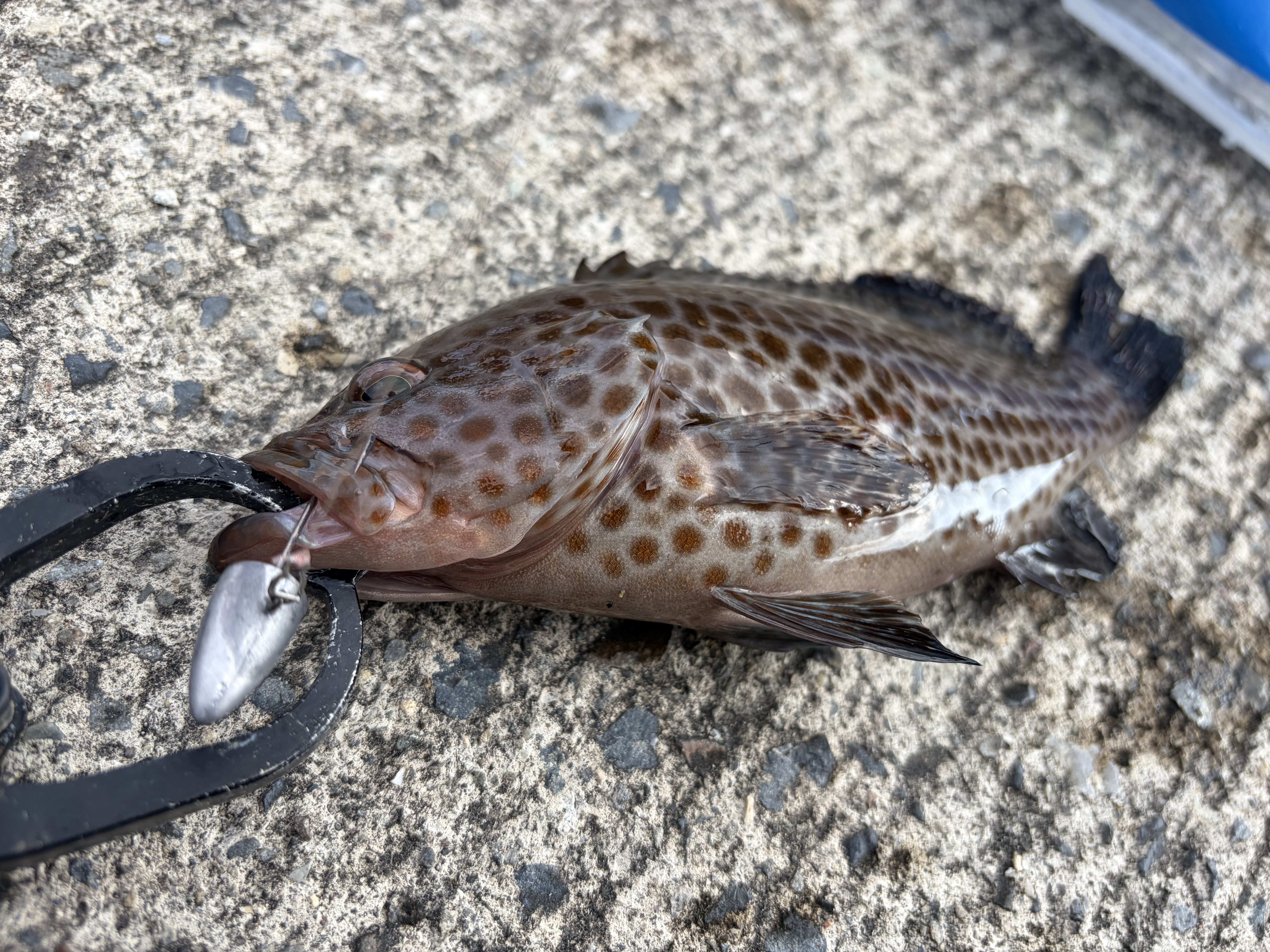 使用するのエサは【浜市 キビナゴ徳用パック】にジグヘッドは【ドリームアップ DD HEAD25 10g】です!まずは投げて底を取ります。少しだけ底から仕掛けを少し上げて待つだけです。さっそくアタリがあります。根に潜られるといけないので早めに合わせてみましたが、針がかりしない事が多かったので竿先が持ってかれるくらい待ってやろう!と思いしんぼうして待つとオオモンハタがヒット!小型ですが、かなりの引きで楽しませてくれました!